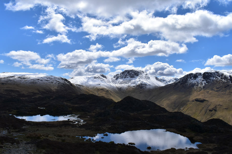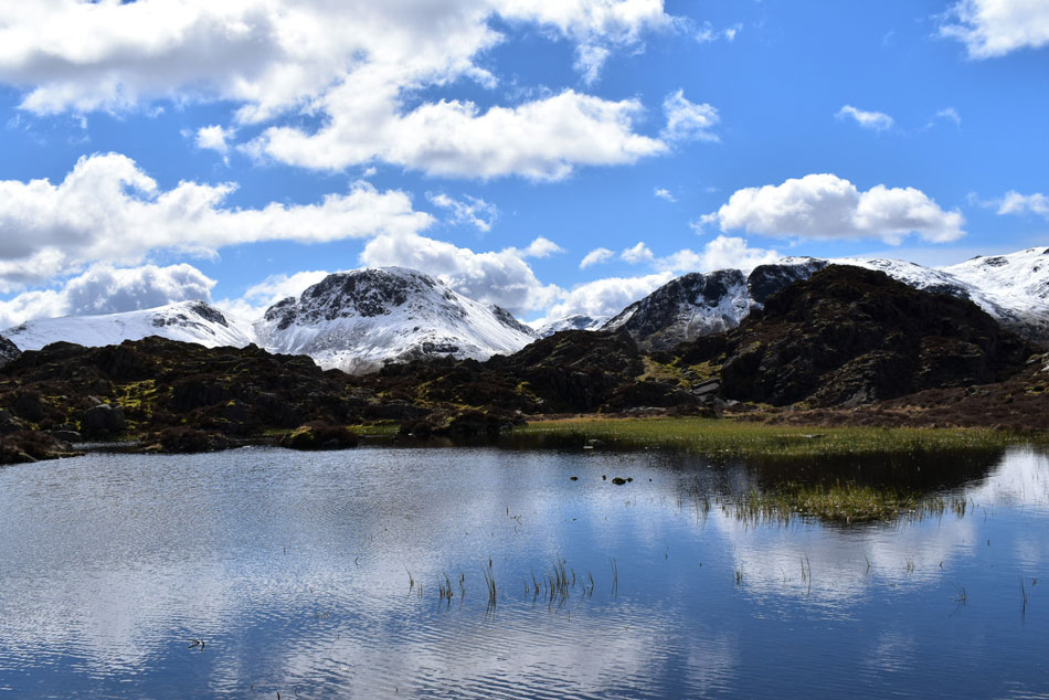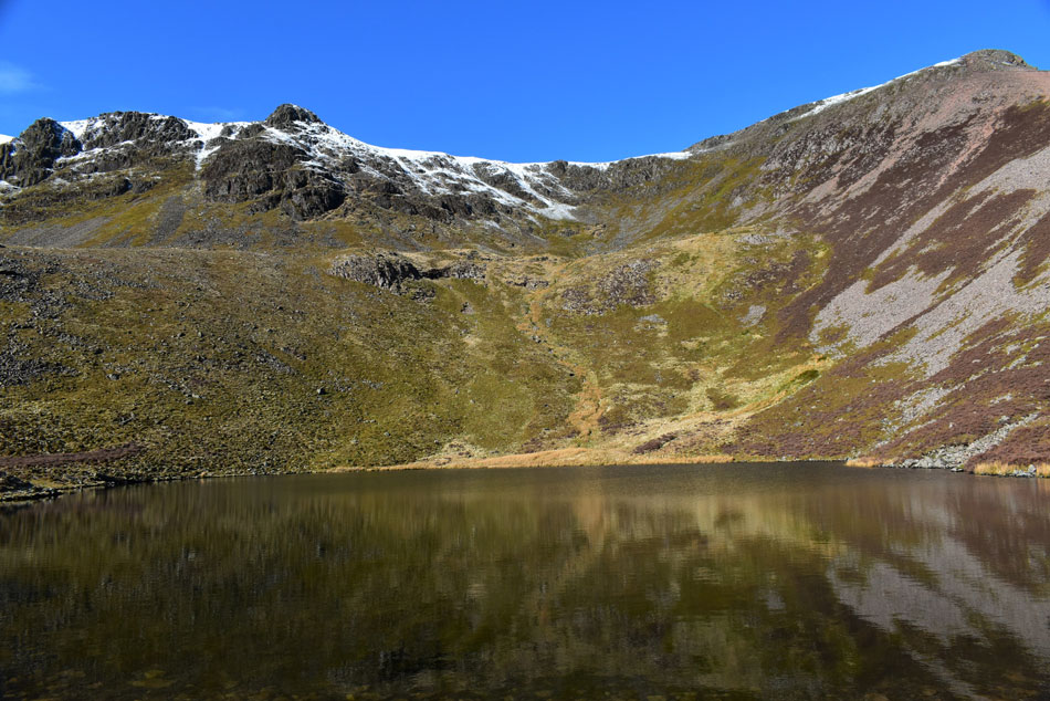 The sun came back out upon reaching Innominate Tarn here as I take in the view towards the Gables and Kirk Fell. |