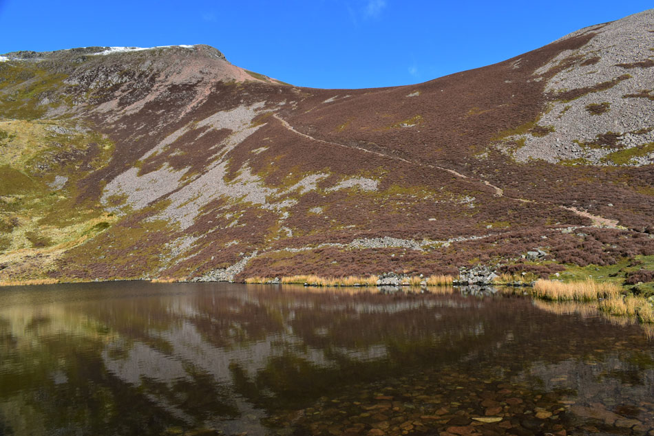 The temperature dipped and by the time I had reached Bleaberry Tarn it was time to add the gloves although I reckon my ears could cope without a hat for now. I'd seen glimpses of the chap I'd seen back at Buttermere who by now is climbing the path above the tarn towards Red Pike summit. |