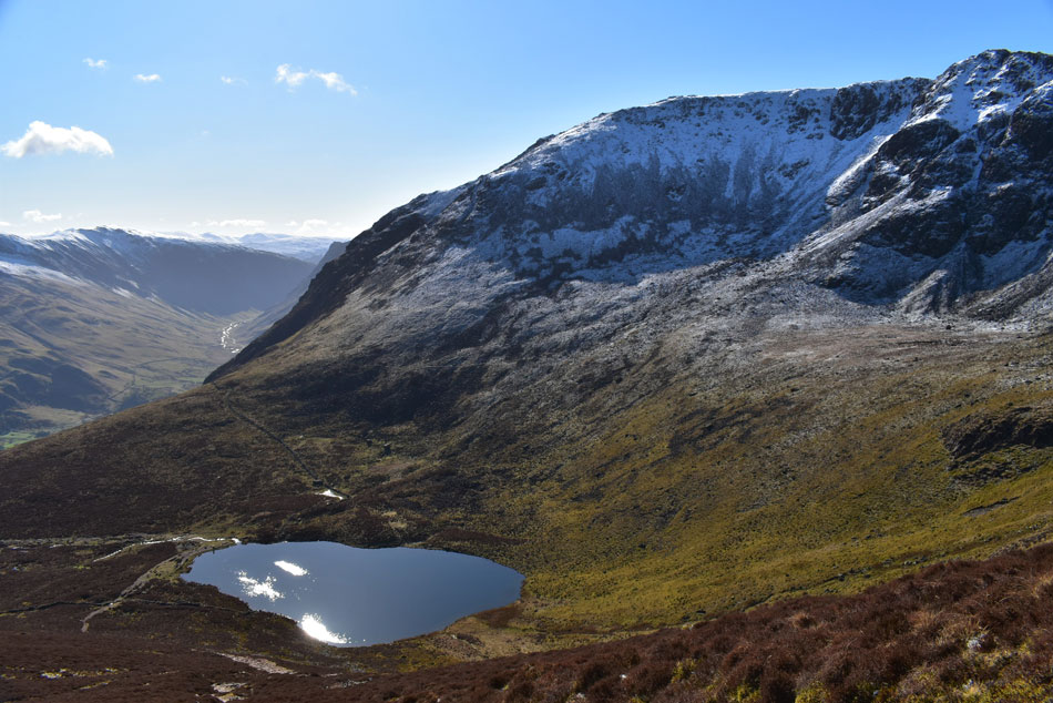 I left the summit where again I was blinded by the sun reflecting off the snow so off came the pack so I could add a pair of sunglasses. The snow started to gather in depth as I descended from High Stile at times letting go beneath my weight sending me everywhere but in a straight line, anyone following must have thought they were following a drunk not a guy trying to find the best line of descent.