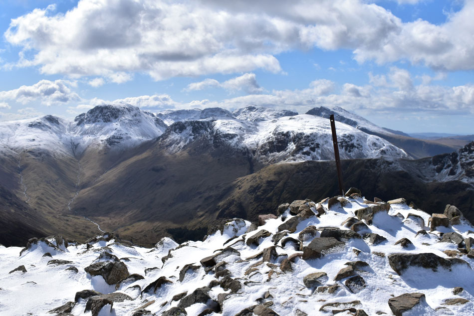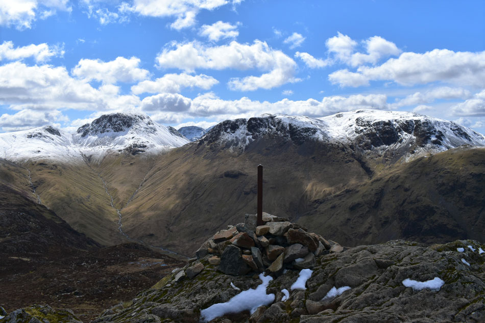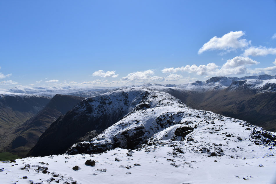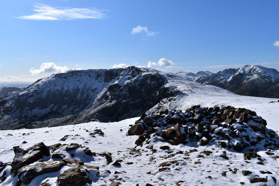Green Gable, Windy Gap, Great Gable, III Crag, Broad Crag, Scafell Pike, Sca Fell, Kirk Fell and Looking Stead from High Crag summit. |