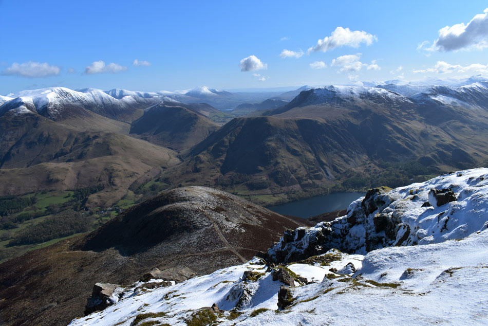 Rannerdale Knotts, Grasmoor, Whiteless Pike, Wandope, Sail, Scar Crags, Causey Pike, Skiddaw, Ard Crags and Knott Rigg fill the view not forgetting Dodd in the foreground and Crummock Water over on the left. |