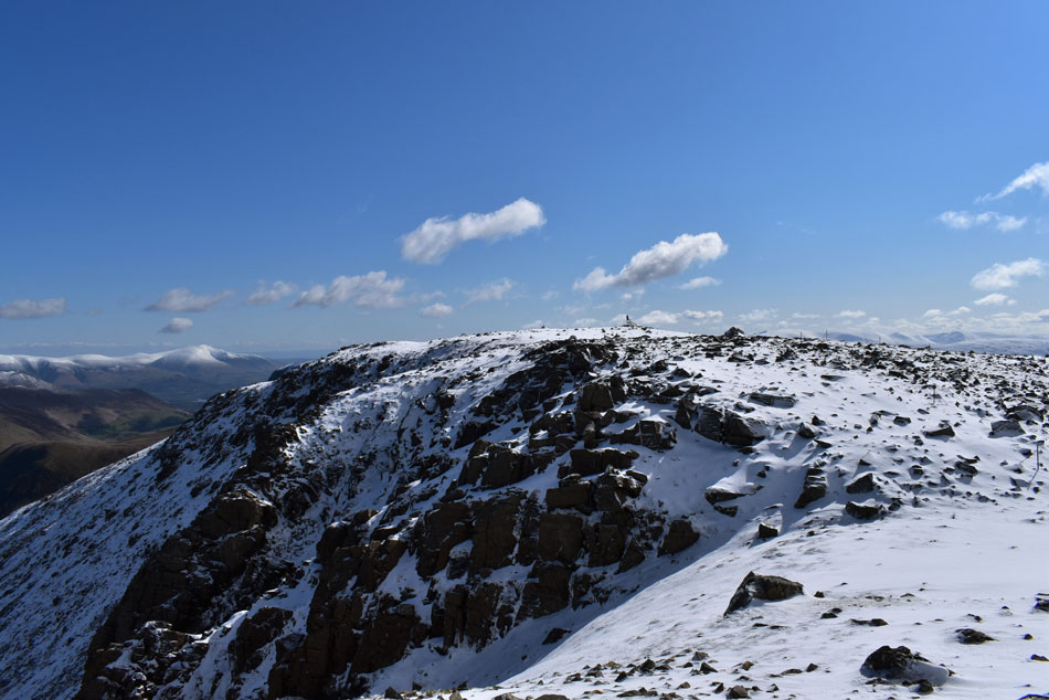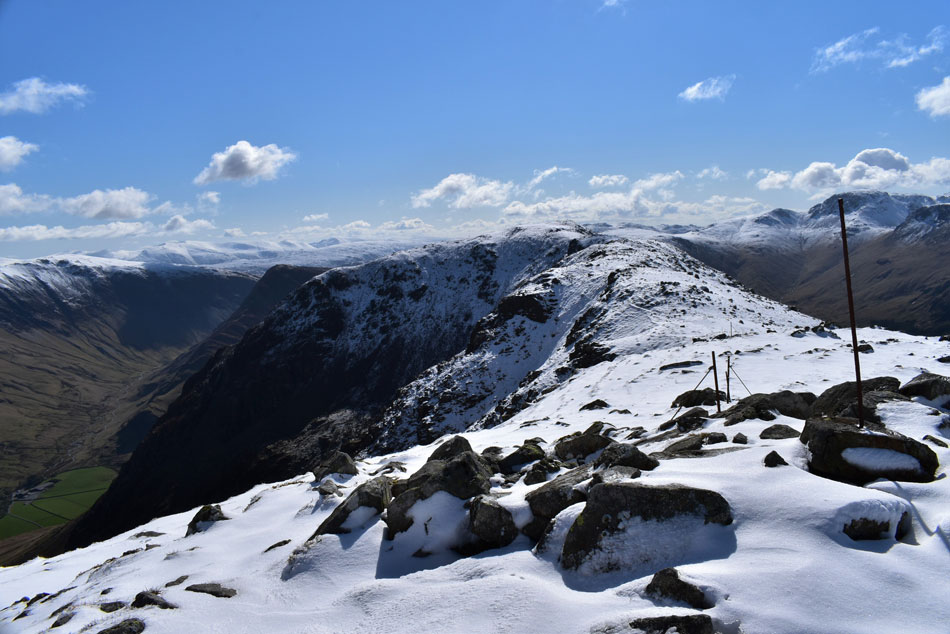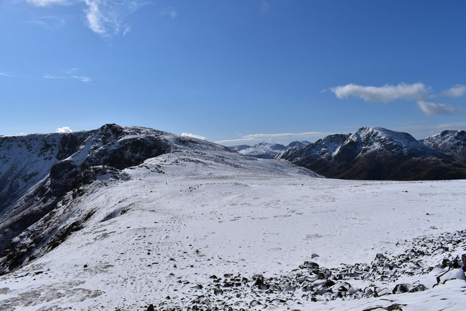 The path below the summit was as eroded as I'd remembered but I still enjoyed its ascent nonetheless especially the little rock gully which had snow drifts deep enough to swallow the bottom half of my walking pole. I was met by an almost blinding light as the sun reflected off the fresh snow which probably added to the suntan I currently have burned across my face one day later. The chap was nowhere to be seen but judging off his footprints he too was heading for High Stile. |