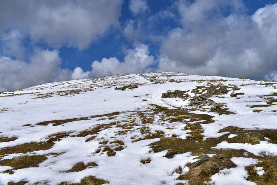 I continued my push towards the summit as my walking pole tips, boots and trouser bottoms balled up with heavy slushy snow each footprint produced a slopping sound as if I was walking through a couple of inches of water, I practically was. After two false summits the summit cairn appeared and what a site it was my pace quickened as I raced towards it. The sight of the cairn brought me so much joy and instantly I regained my mojo. Despite my wheezing breath, my aching limbs I had reached Dale Head. Hindscarth and Robinson were there for the taking. |