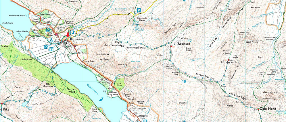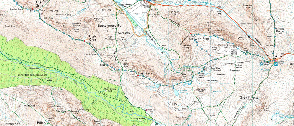 Newlands Pass - Buttermere - Old Burtness - Bleaberry Tarn - The Saddle - Red Pike (Buttermere) Top of Chapel Crags - High Stile - High Crag - Gamlin End - Seat - Top of Scarth Gap Pass - Hay Stacks - Innominate Tarn - Black Beck Tarn - Dubs Hut - Fleetwith Pike - Black Star - Honister Mine - Yewcrag Quarries - Dale Head - Hindscarth Edge - Hindscarth - Littledale Edge - Robinson - Buttermere Moss - High Snockrigg - Newlands Pass |