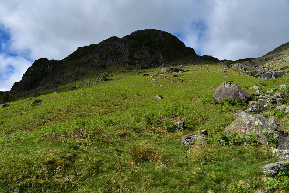 My plan of attack is to head over to the area above Hard Tarn which I will do by heading towards the buttress then climb left through the patch of scree. |