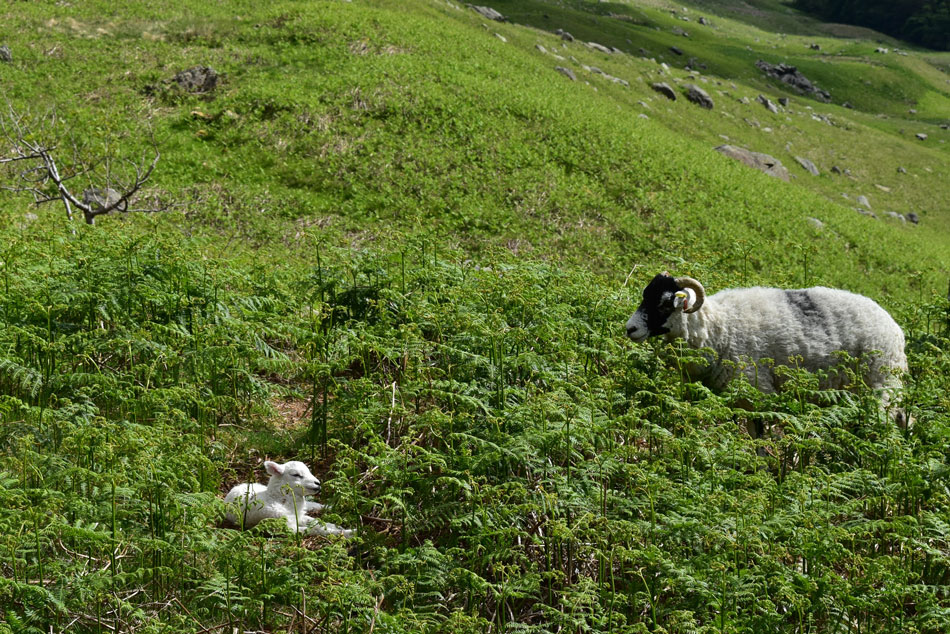 After a steep short pull I arrive at a break in a stone wall where a wooden fence links the wall back together, up against the fence a group of boulders can be used to help pass over the fence - I commit by throwing my walking poles over first, pass the fence easily before spotting this lamb and its mother enjoying the sunshine. |