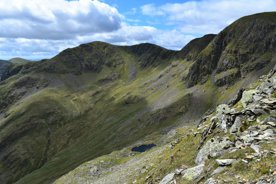 On this side a narrow rocky ridge bounded by forbidden crags falls steeply between twin hollows, deeply recessed, in a wild and lonely setting, here is solitude, for here few men walk. Here too, is a gem of a tarn. |