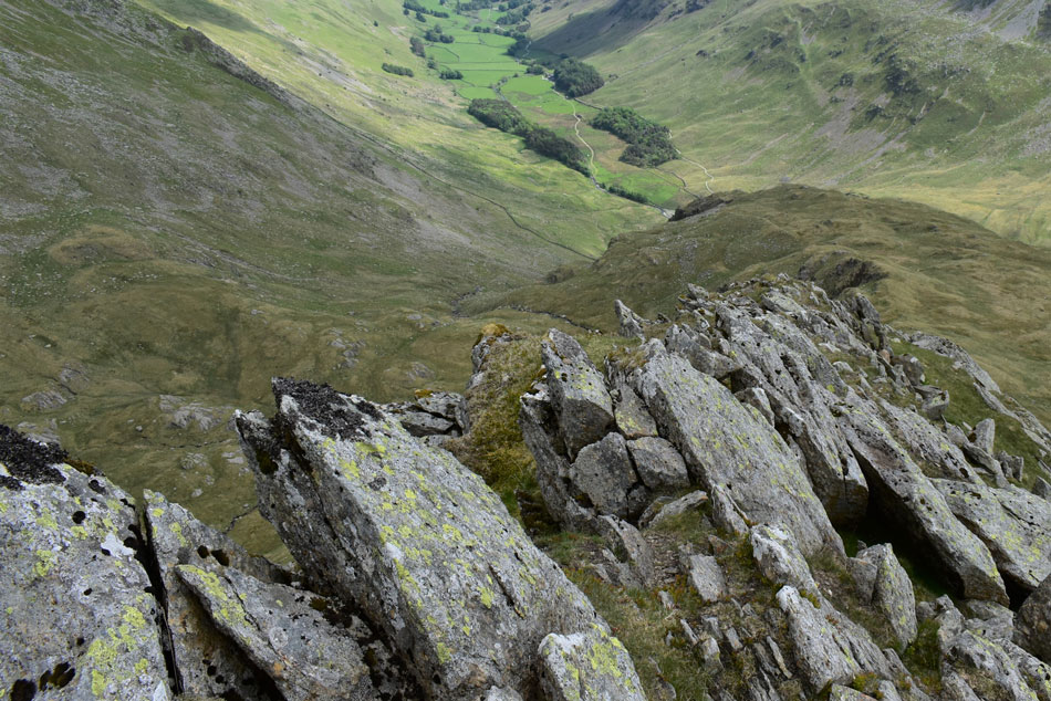 The Grisedale valley from the rock arete atop Nethermost Pike East ridge. |