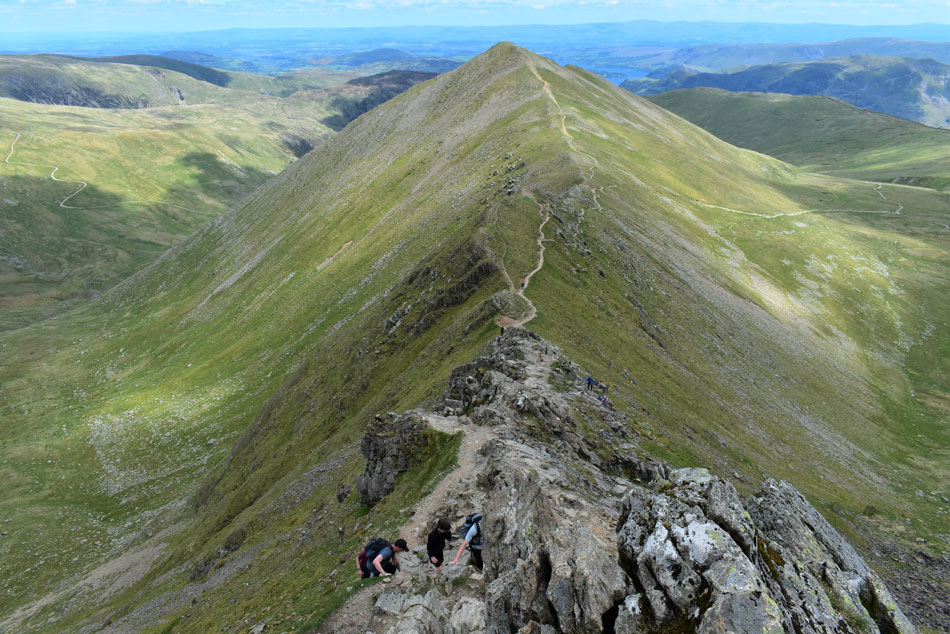 Looking back on Helvellyn with Striding Edge seen left and Swirral Edge seen right. |
