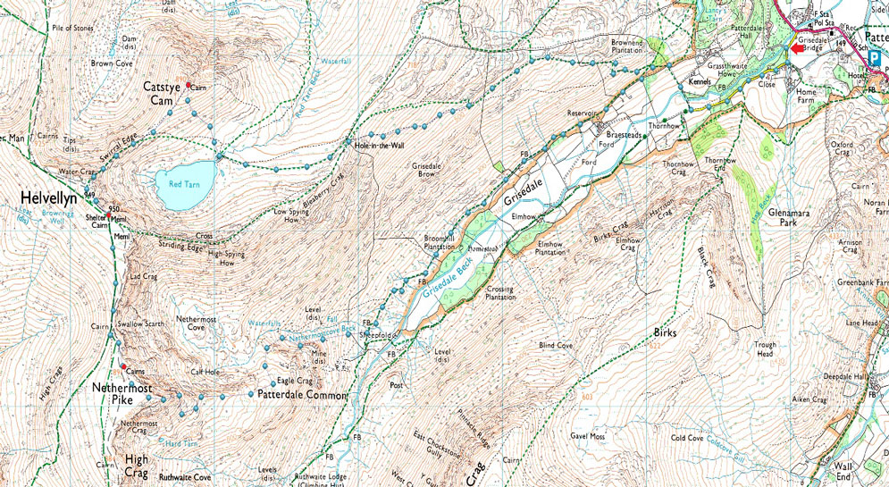 Grisedale Lane - Grisedale - Nethermostcove Beck - Nethermost Pike East Ridge - Nethermost Pike - Helvellyn - Swirral Edge - Catstye Cam - Red Tarn (Helvellyn) - Hole-in-the-Wall - Grisedale - Grisedale Lane |