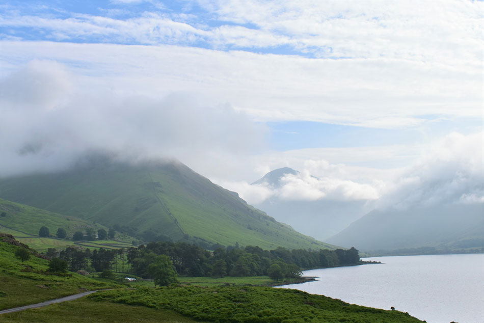 Yewbarrow and Great Gable misted in valley cloud from the shores of Wast Water. |