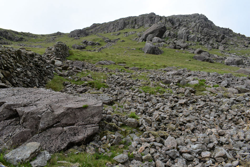 With Dore Head and Dorehead Screes seen further right. Before I head for the stone wall I plan to make a visit to the Y Boulder situated not far from the start of the climb. |