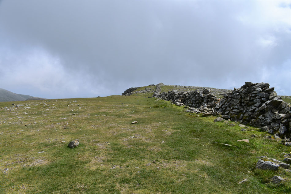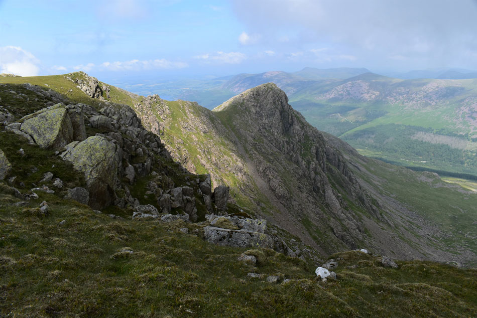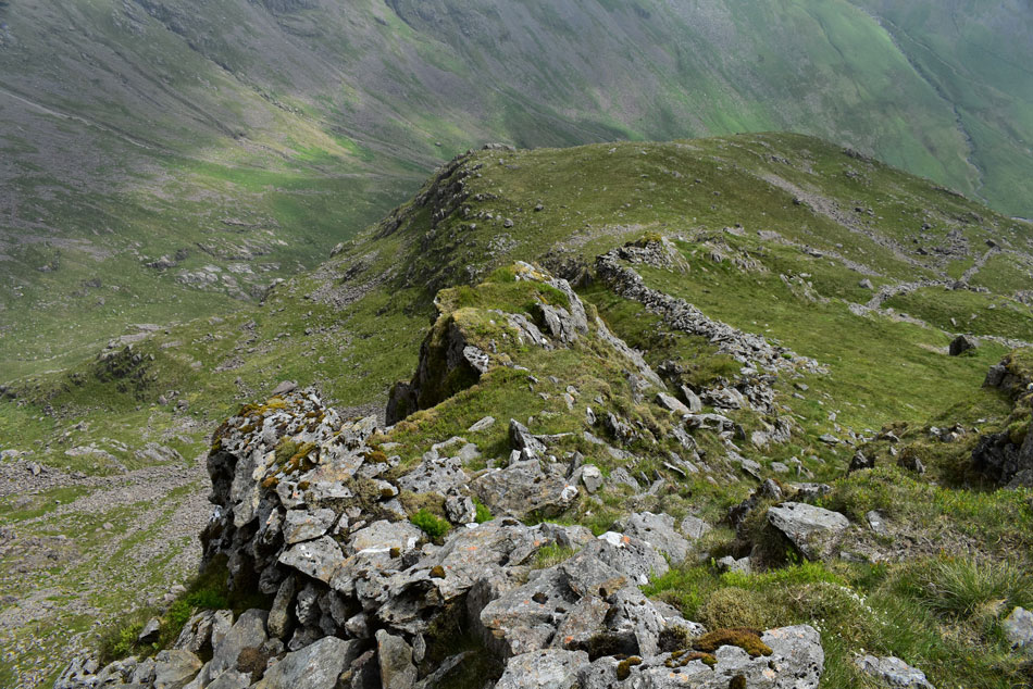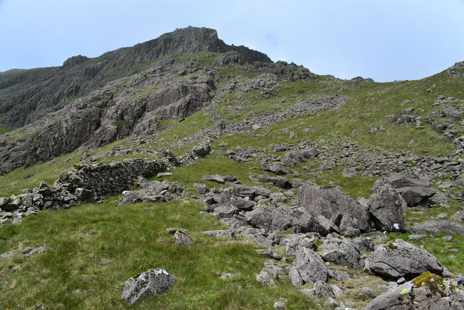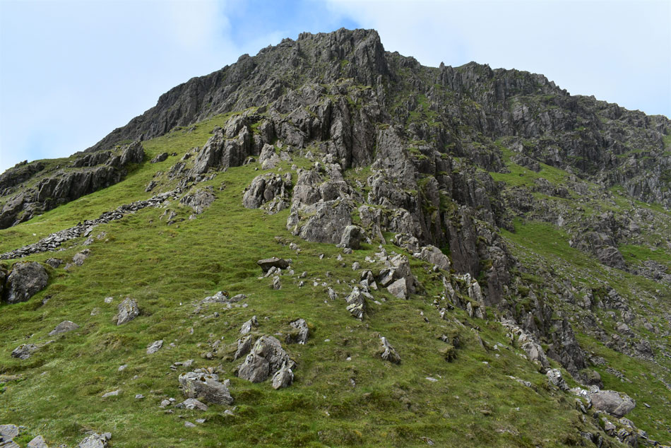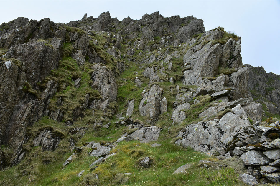 I leave the stone wall to take in the view of the outline of the ridge which on paper looks a lot more precarious than it does in person. From here I continue my ascent towards the left via the steep grassy incline then continue to the base of the buttress/ridge up ahead. |