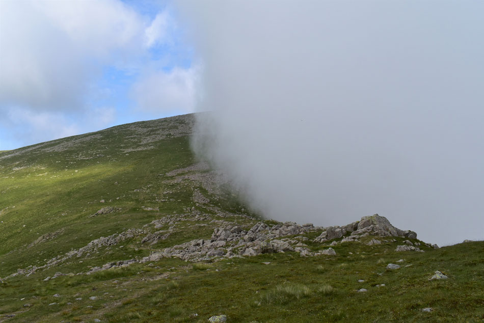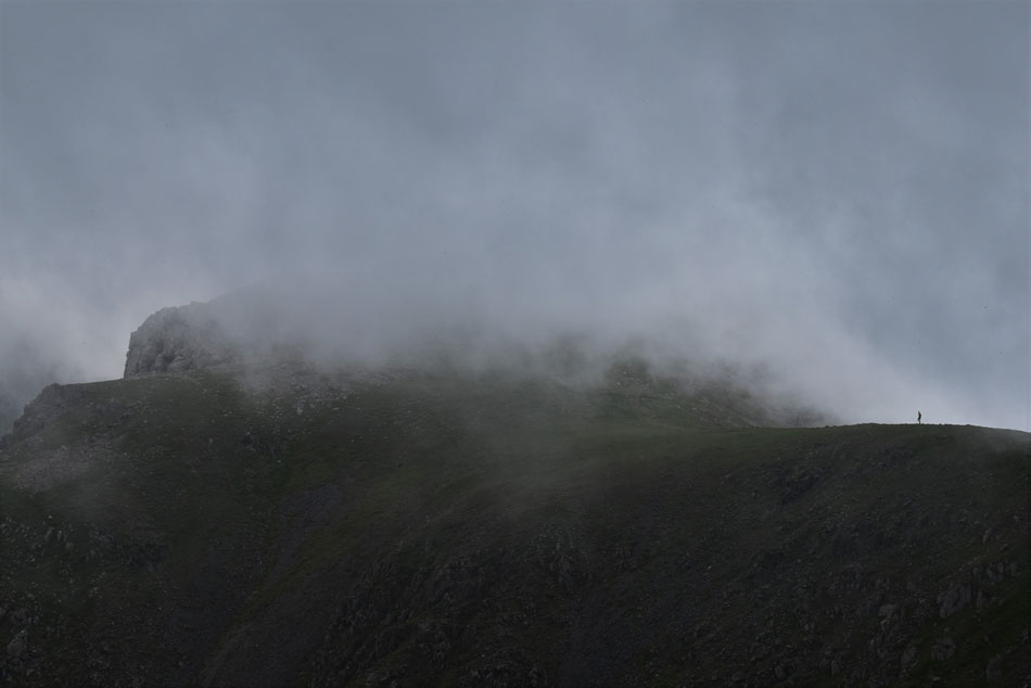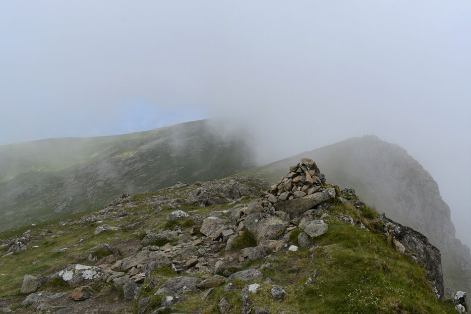 With the grass rake behind me I was lead directly onto the summit plateau right at the same time as the cloud lowered and the summit was consumed by cloud. The temperature had plummeted too but not enough for me to add my jacket as I prepare my legs and lungs for the ascent on Scoat Fell. |
