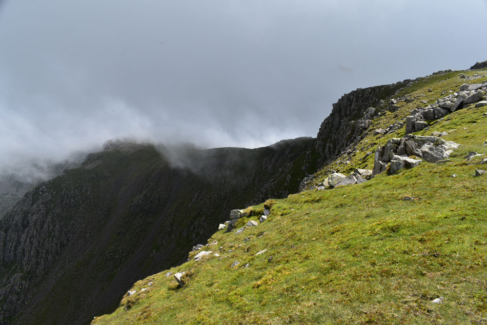 A steep grassy rake ascends the final part of the ascent onto the summit. |