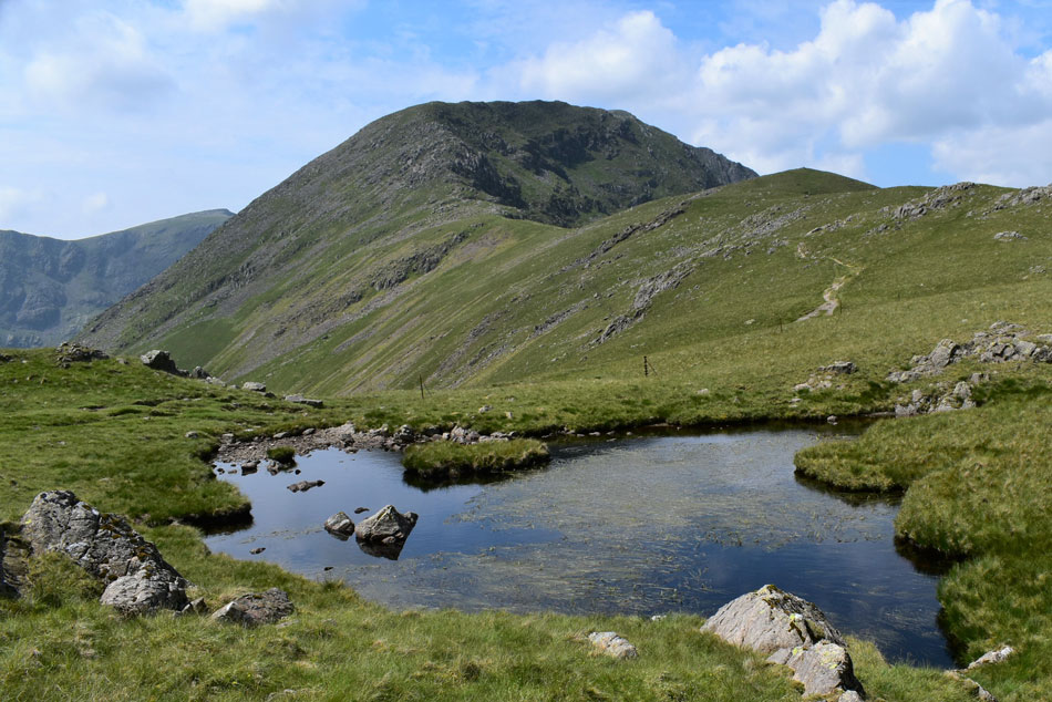 From here Kirk Fell looks like it's almost split into two by Baysour Slack which divides the north summit (left) from the main summit seen (right) Those with a keen eye might be able to spot a small tarn below the outcrop of rock seen lower left which I'll be heading to after summiting Looking Stead. |