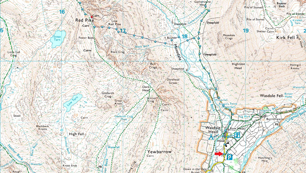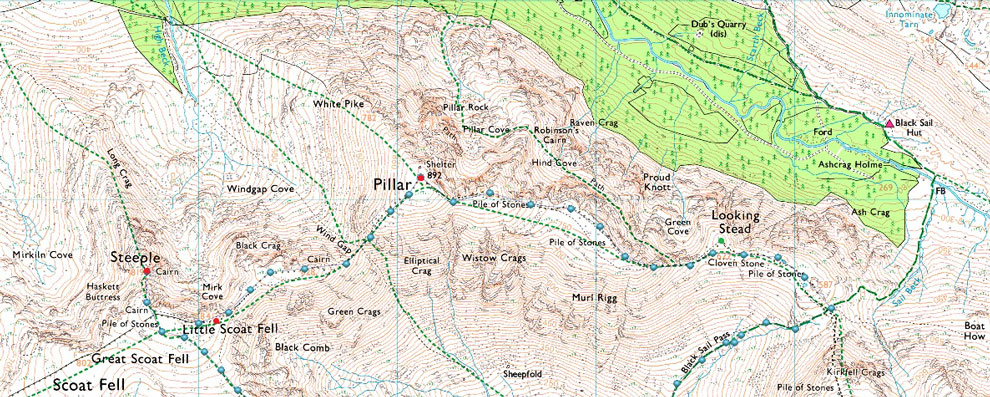 Wasdale Head - Mosedale - Mosedale Beck - Y Boulder - Low Red Pike - Red Pike - Steeple - Scoat Fell - Black Crag - Wind Gap - Pillar - Looking Stead - Top of Black Sail Pass - Gatherstone Beck - Mosedale - Wasdale Head |