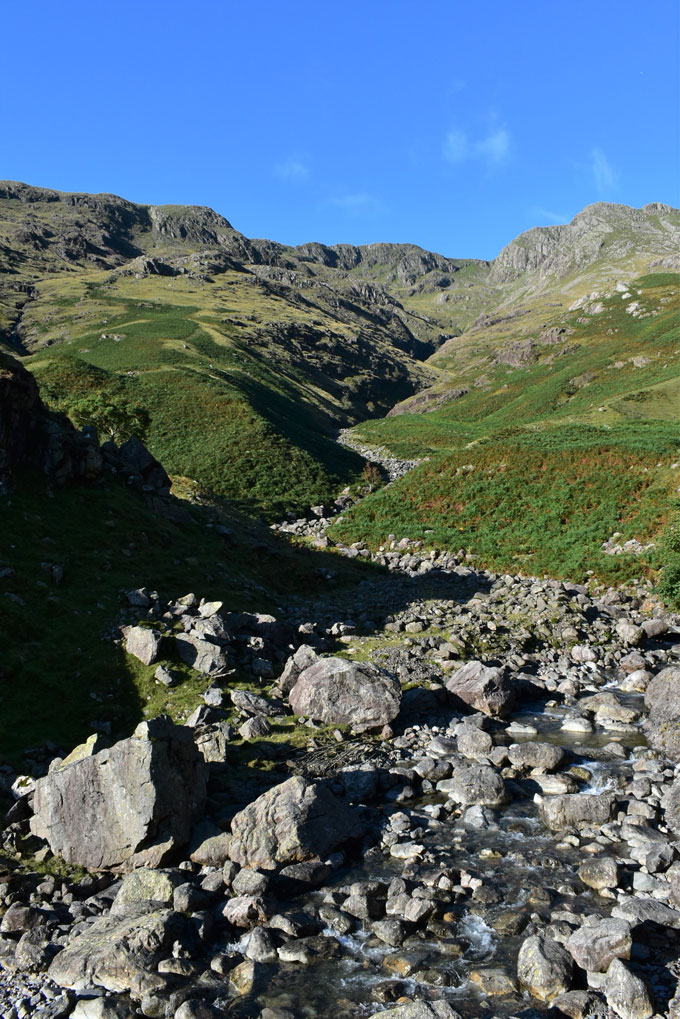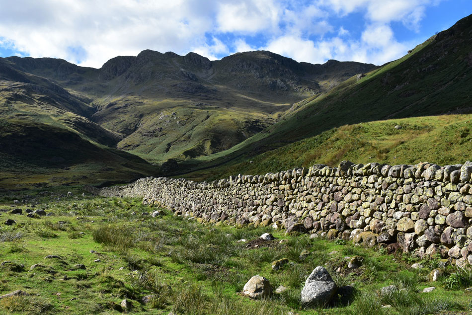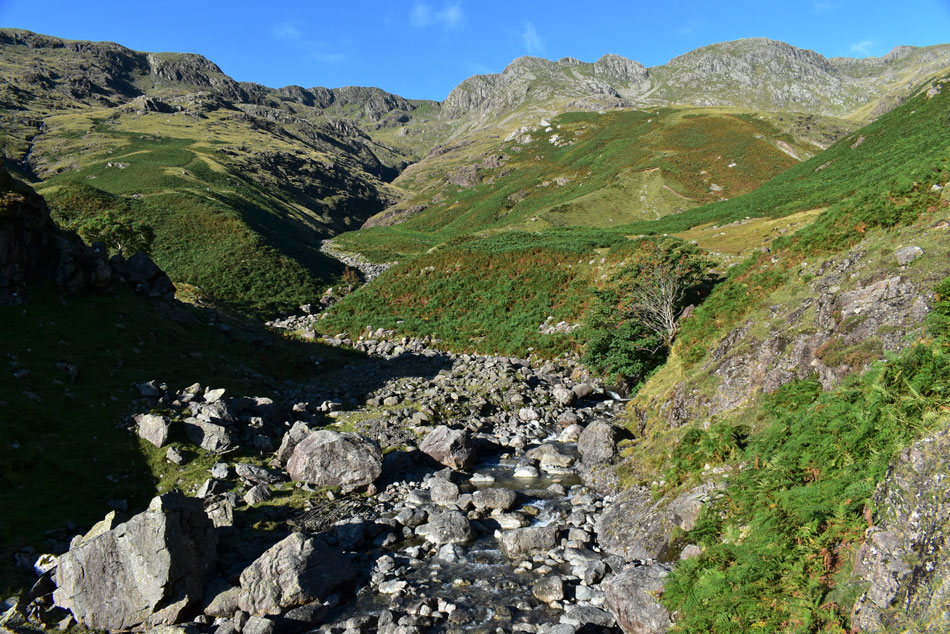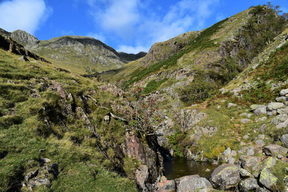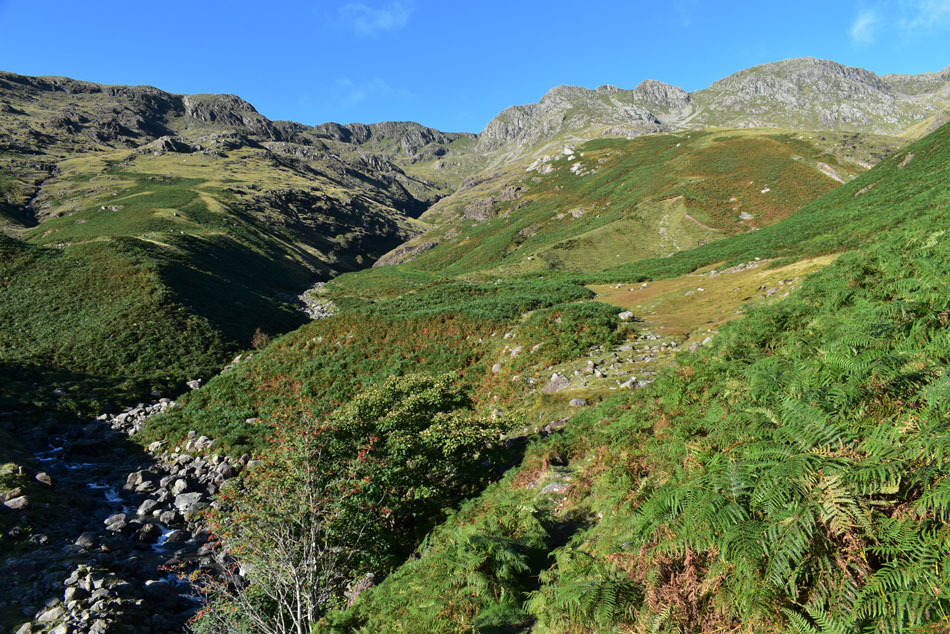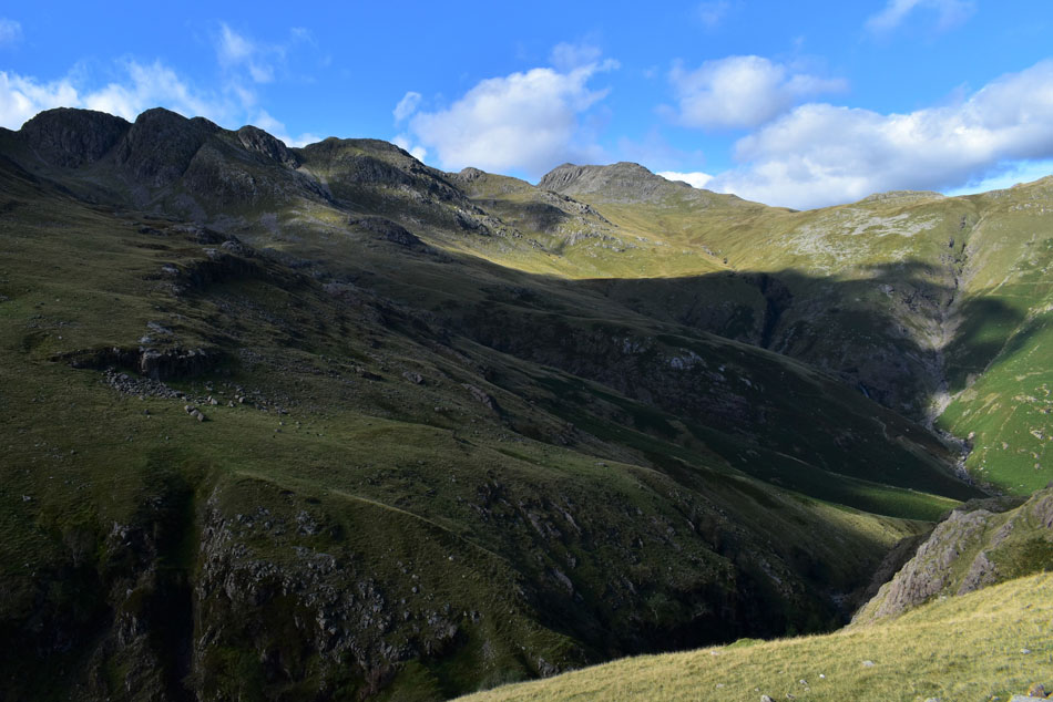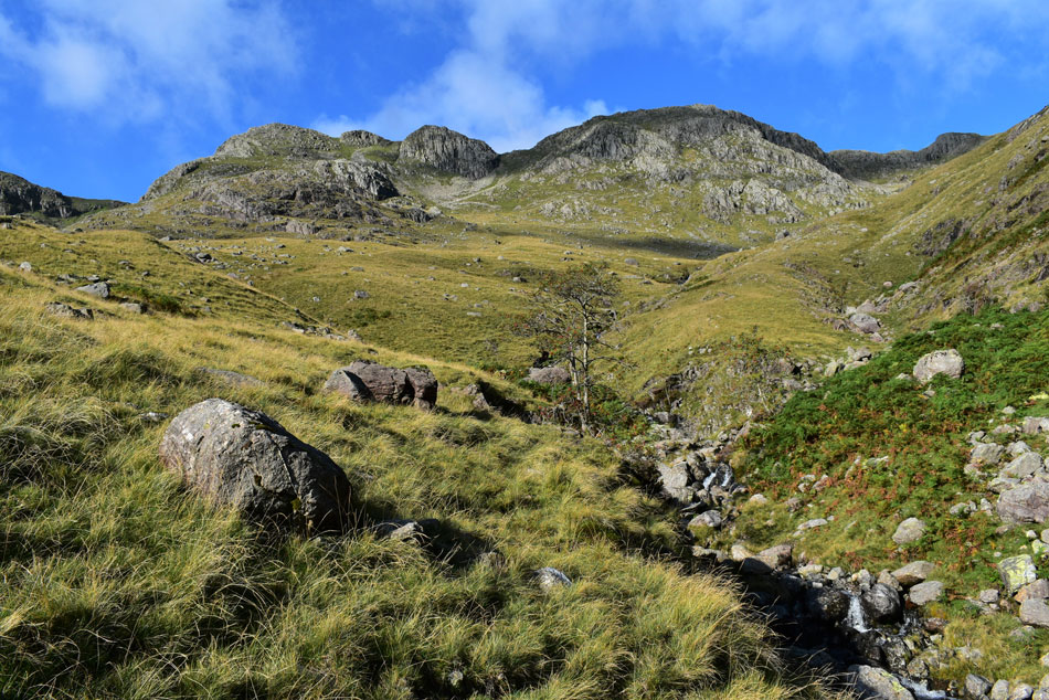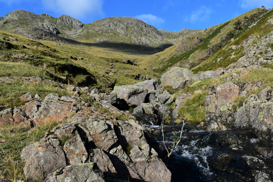 Crinkle Gill, Crinkle Crags, Gunson Knott and Shelter Crags from Oxendale Beck. |