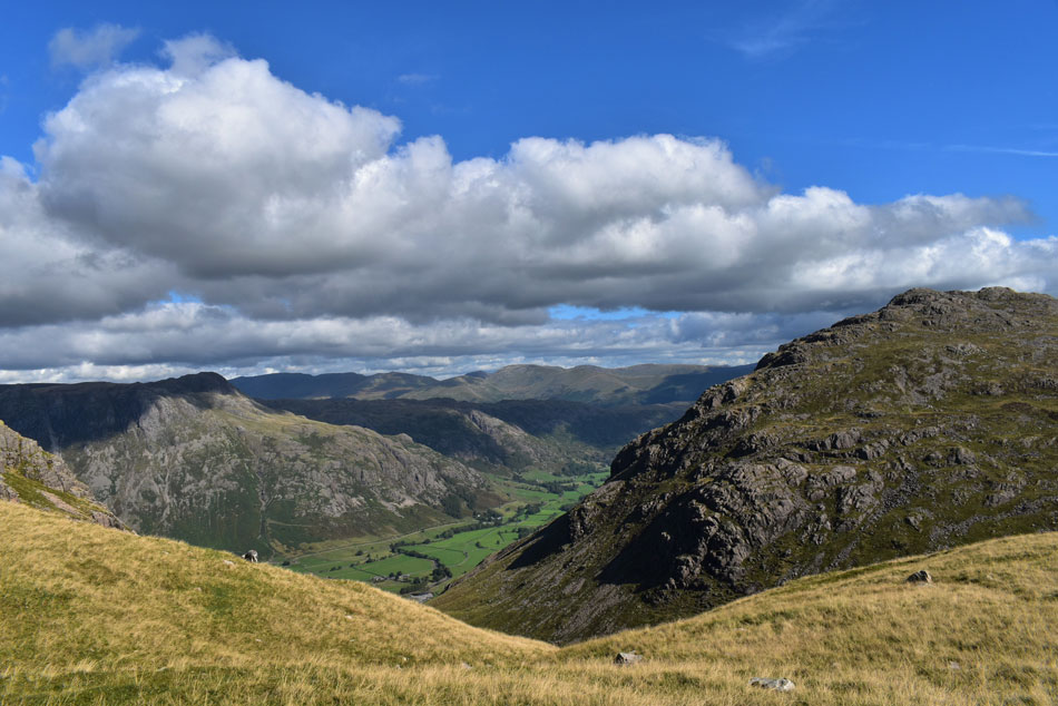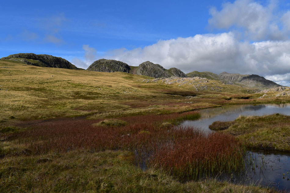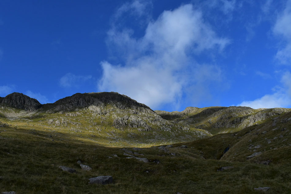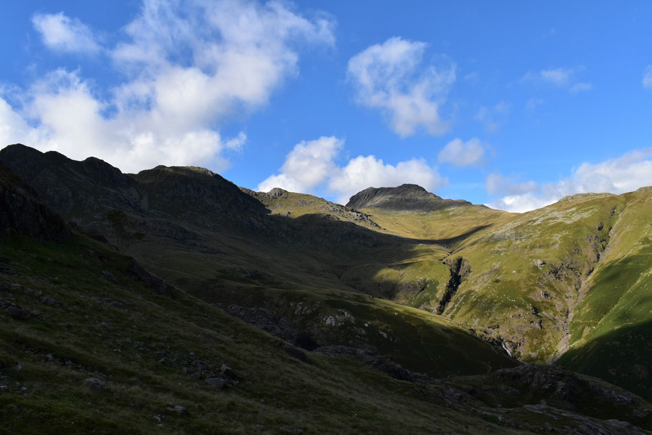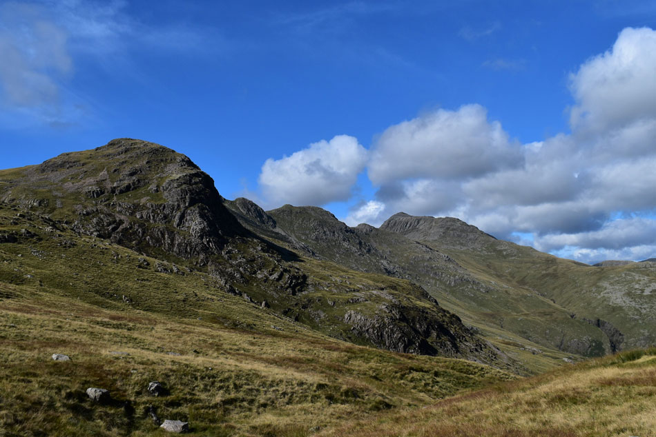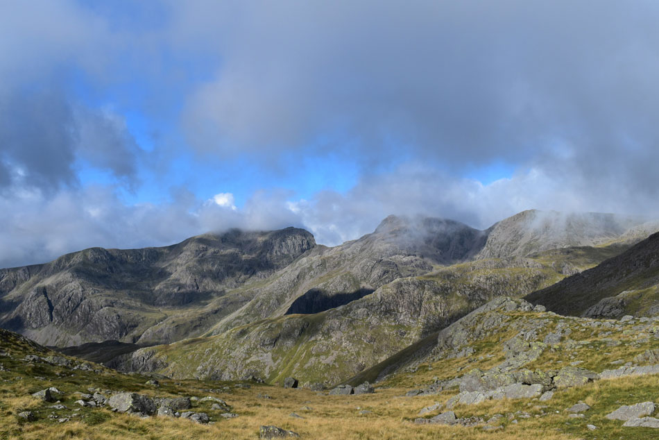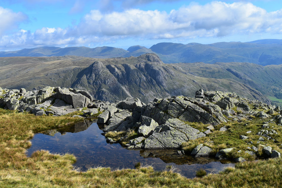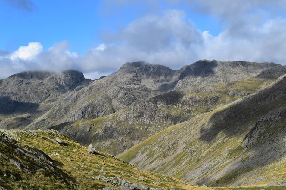 Views of Great Knott, Crinkle Crags, The Band and Bow Fell. |