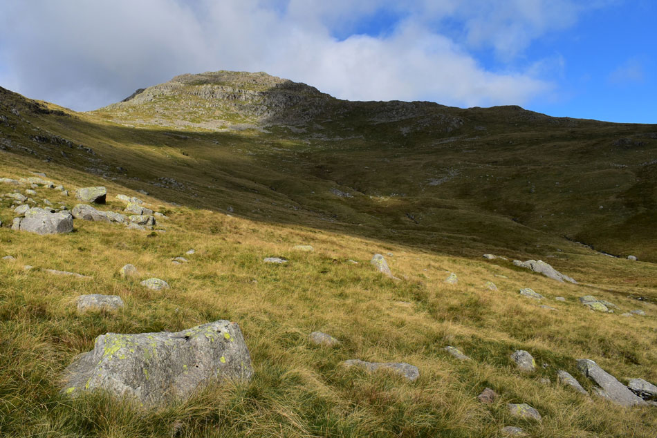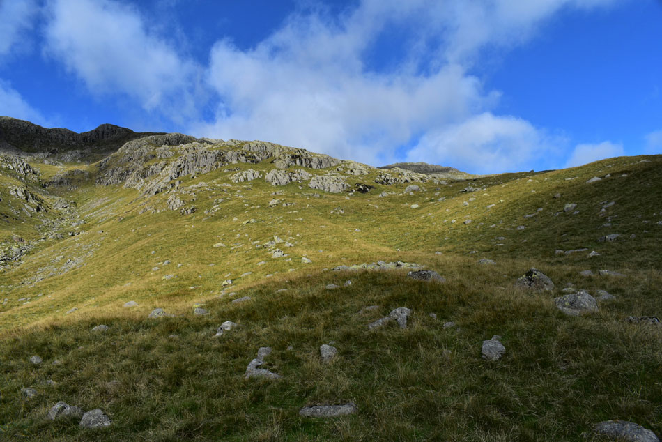 My plan was to visit todays final summit of Great Knott seen centre left via Stonesty Pike before having a change of plan where I would traverse the head of Gaitscale Gill seen to the right of the crags far left which although direct, was quite tricky underfoot. |