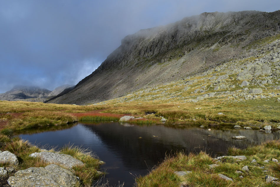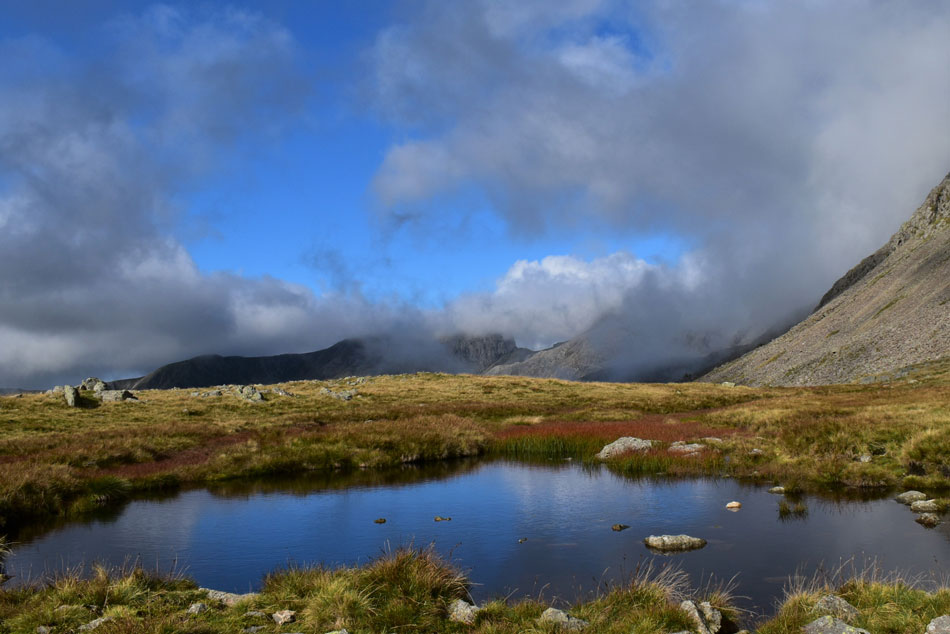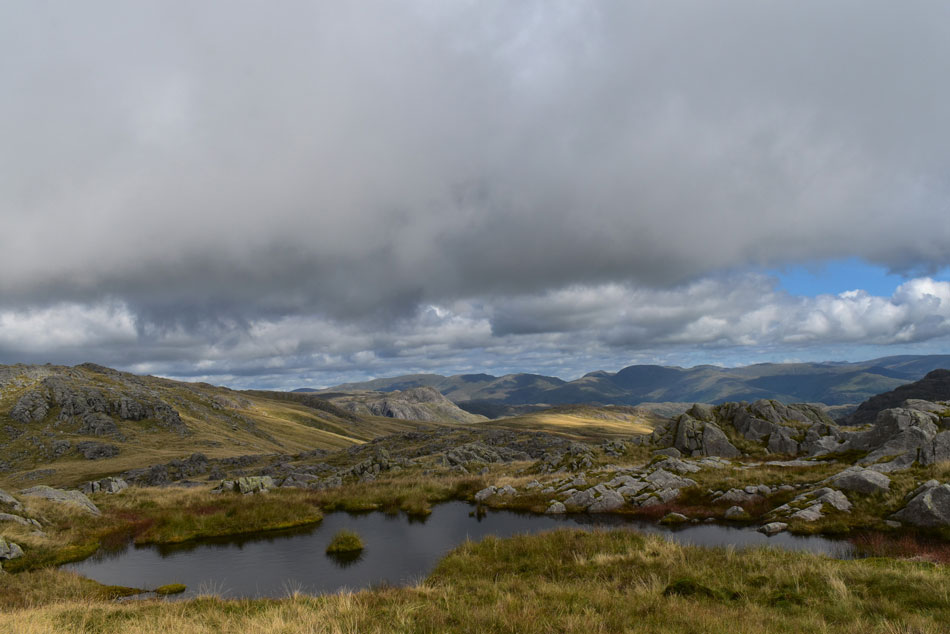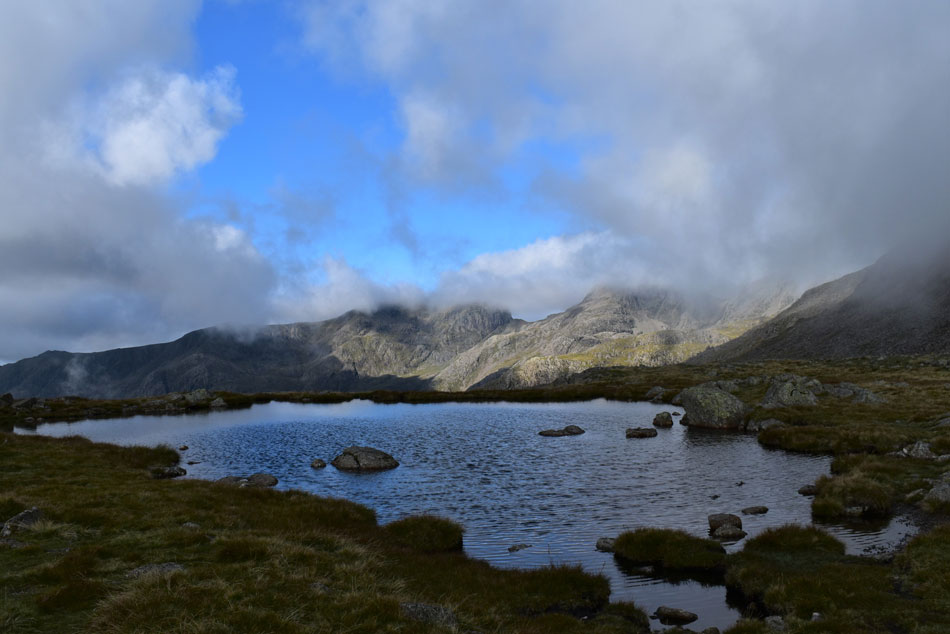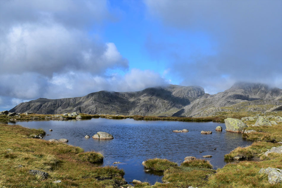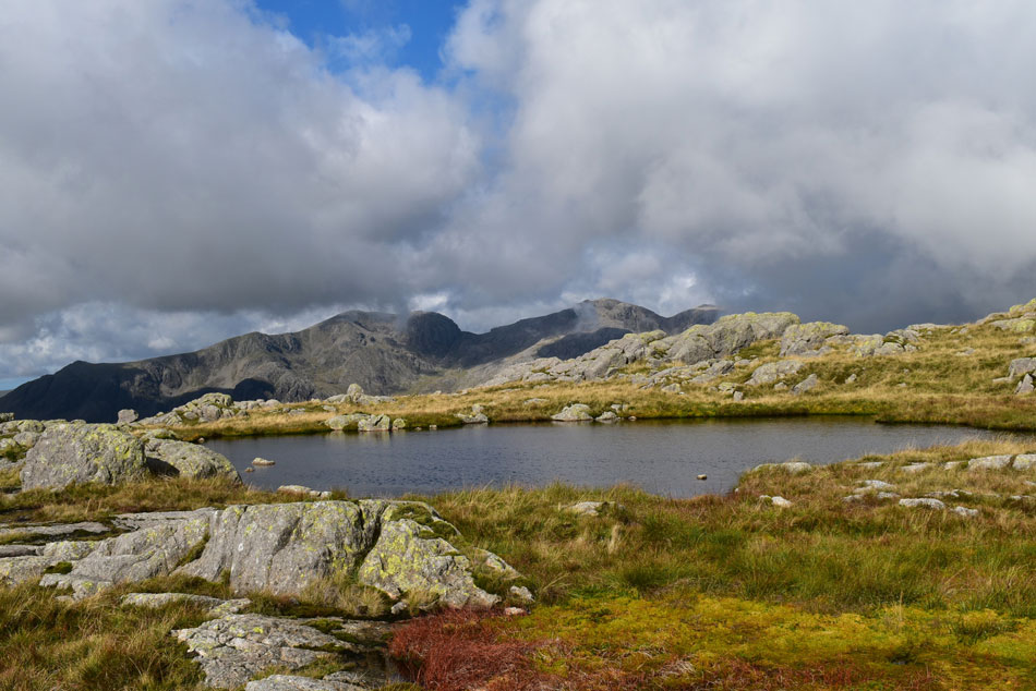 For the first time I started to bump into people at the cross roads that is Three Tarns firstly by a chap who had just come from the direction of Crinkle Crags then by two couples who had descended Bow Fell. We all stopped to admire the cloud dramatics over the Scafells. |
