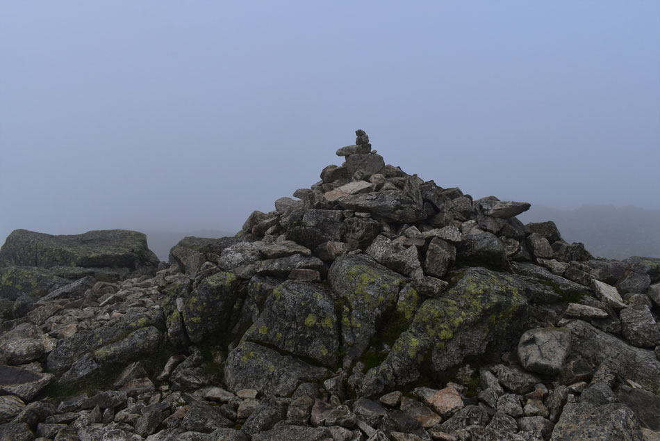 Between Crinkles three and four I passed two walkers before beginning my ascent on Crinkle four (Crinkle two if travelling south to north) Where I found the rock to be wet and greasy, funny how conditions change quickly too not encountering rock so slippery previously. Clambering over rock I crested the summit and made my way over to the summit cairn which was eerily quiet. I gave the cairn a tap with my right walking pole then another with my right hand, doubled back right and followed the cairns towards the alternative Bad Step path. |