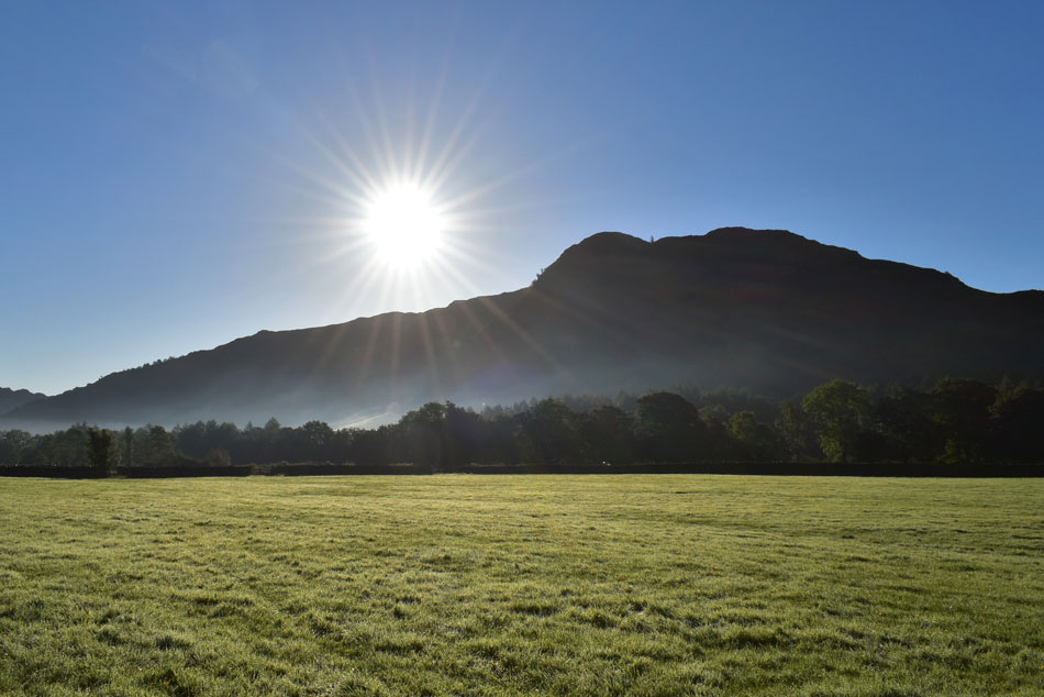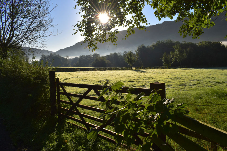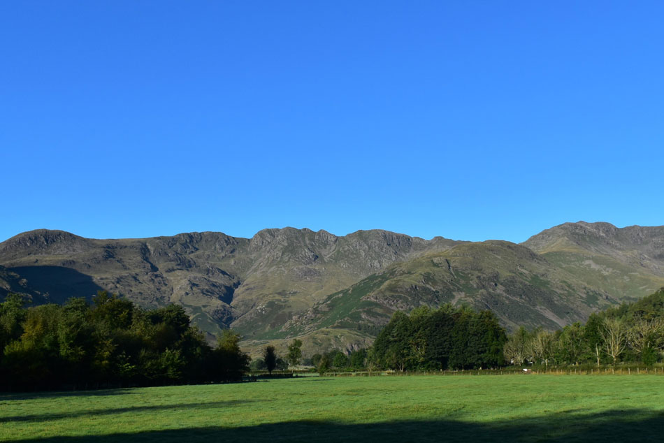 Here looking back across the dew covered fields towards Rossett Bridge and the northern spur of Lingmoor Fell. |