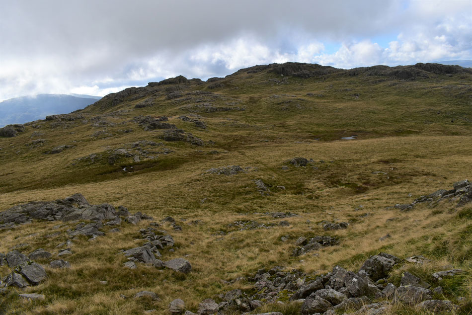 Despite my surrounding summits being cloud free Crinkle Crags was still holding onto a little cloud which left the fell side looking between one shade of dark brown to another. I had remembered using a second alternative path which by-passes a direct descent/ascent of the 5th or 1st Crinkle where by leaving the path at grid reference NY 251 044 the walker can descend easily via a series of grassy banks onto the Stonesty Pike plateau.