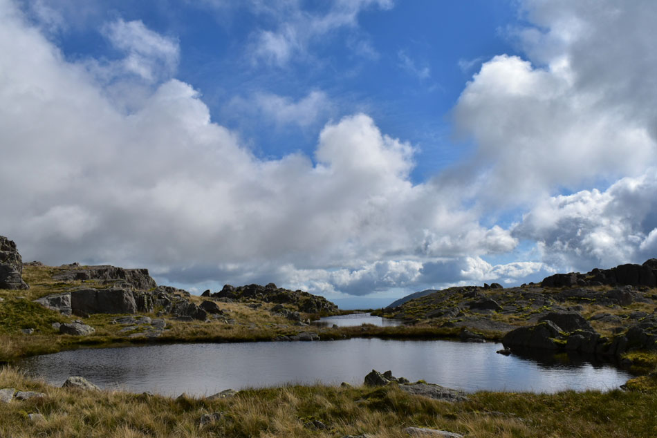 Within minutes of taking the last photo I was enveloped in thick cloud that eerily clung to the summit. One minute I was enjoying the sun soaked views while wiping sweat from my forehead the next I was in almost zero visibility while thinking about adding my hat and gloves, this is how quick the weather changes in Lakeland.