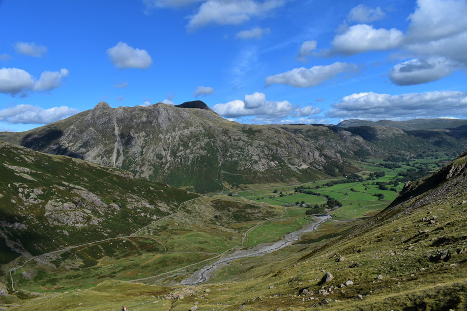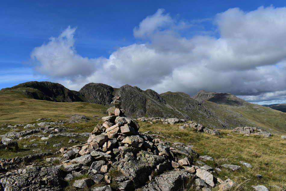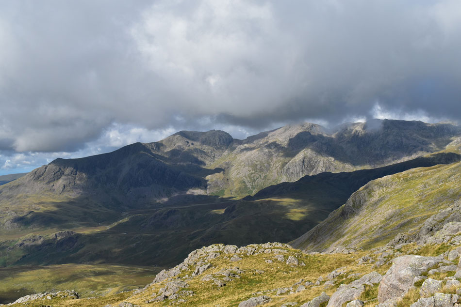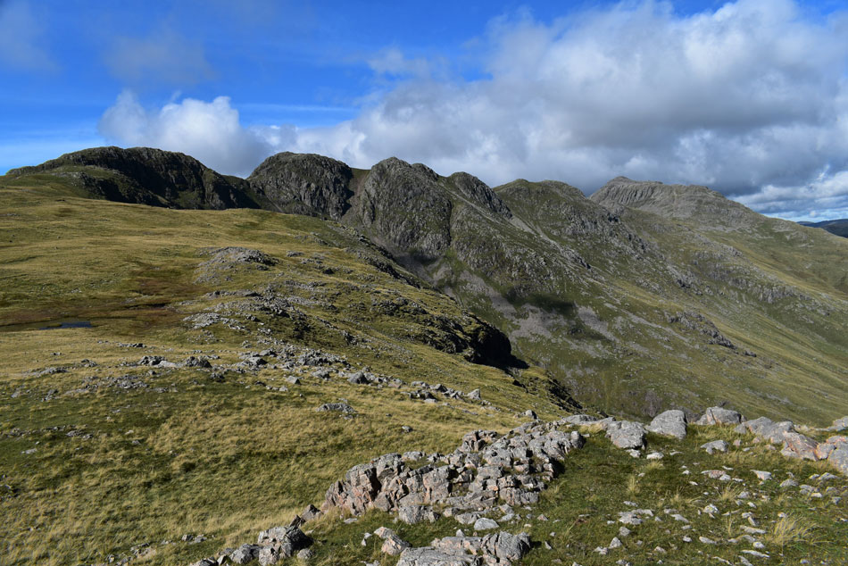 I look back on Bow Fell (right) Esk Pike (centre upper) and Great End (left) with Pike de Bield appearing above the Yeastyrigg Crags ridge (centre left). |