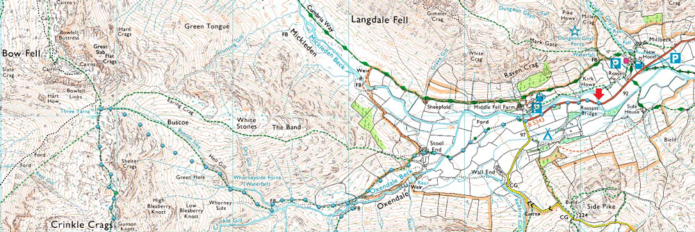Crinkle Crags, Bow Fell, Hell Gill, Dry Gill and Browney Gill. |