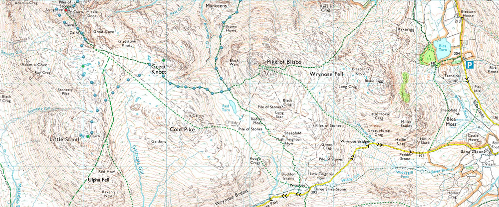 Rossett Bridge - Stool End Farm - Oxendale Beck - Hell Gill - Buscoe Sike - Three Tarns - Shelter Crags - Crinkle Crags - Stonesty Pike - Little Stand - Great Knott - Red Tarn (Langdale) - Brown Howe - Oxendale - Oxendale Beck - Stool End Farm - Rossett Bridge |