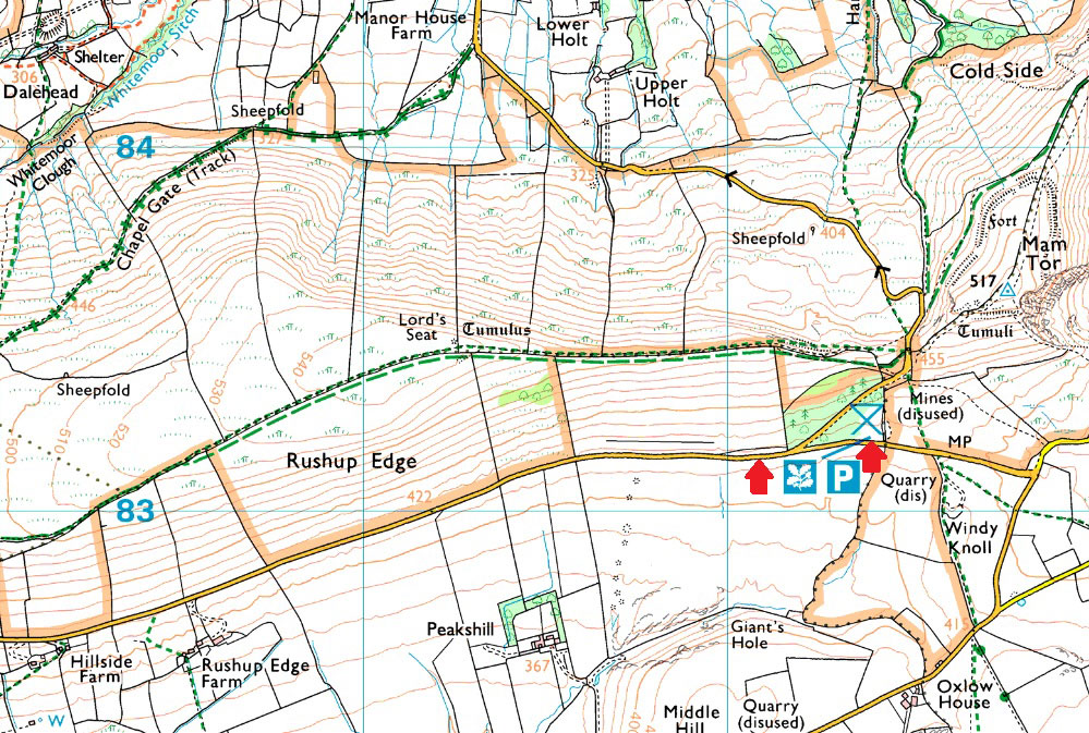Mam Tor National Trust Car Park - Mam Tor - Hollins Cross - Hollins - Edale Road - Barber Booth - Chapel Gate (track) Rushup Edge - Lord's Seat - Mam Tor National Trust Car Park |