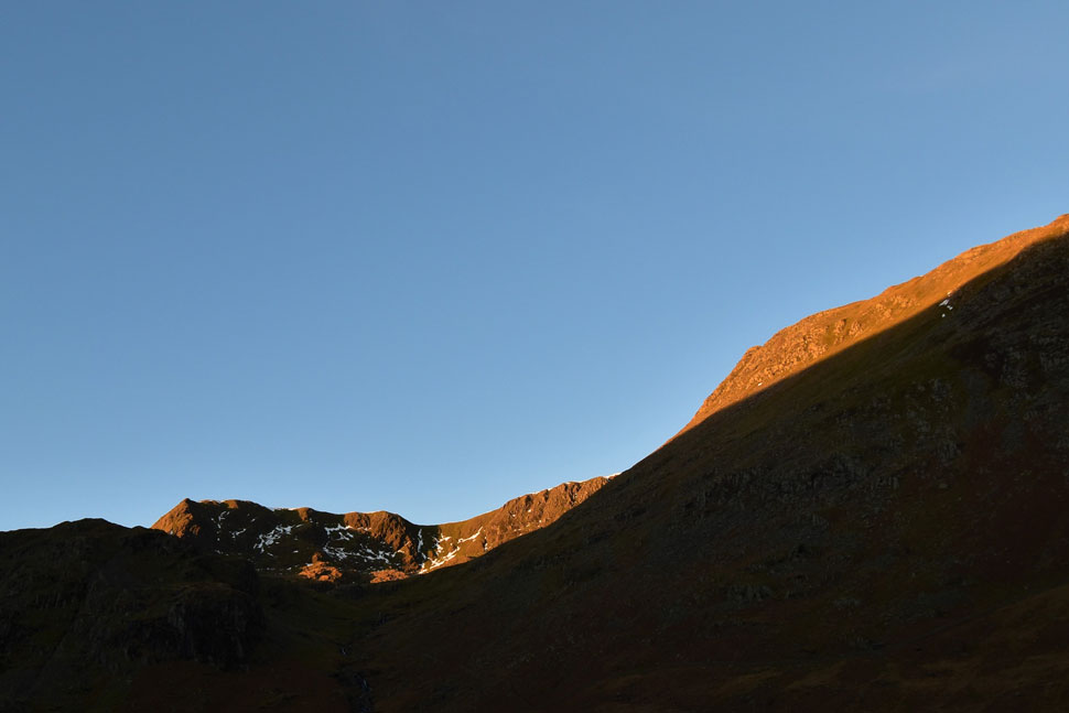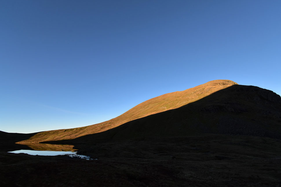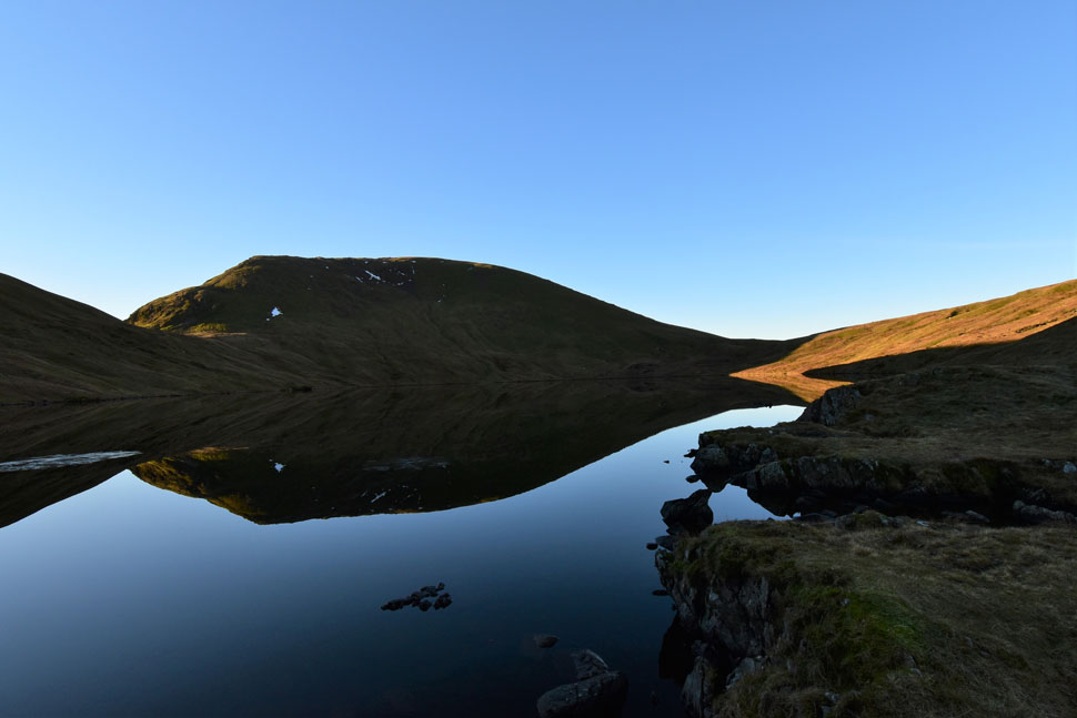 Sunlight still hadn't penetrated the valley but it was ever so slowly edging its way down the fell side leaving spectacular light shows across the fell reflecting here into Grisedale Tarn. |