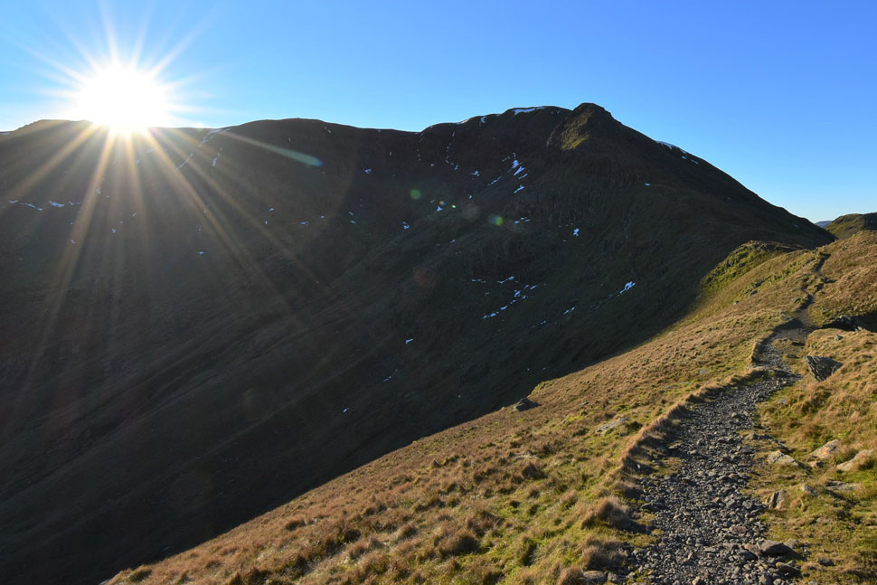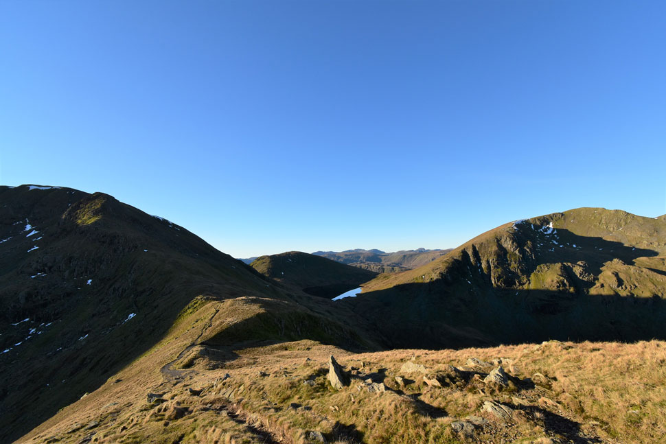 ...Dollywagon Pike comes into view with distant views of Bow Fell, the Gable and the Scafells. |