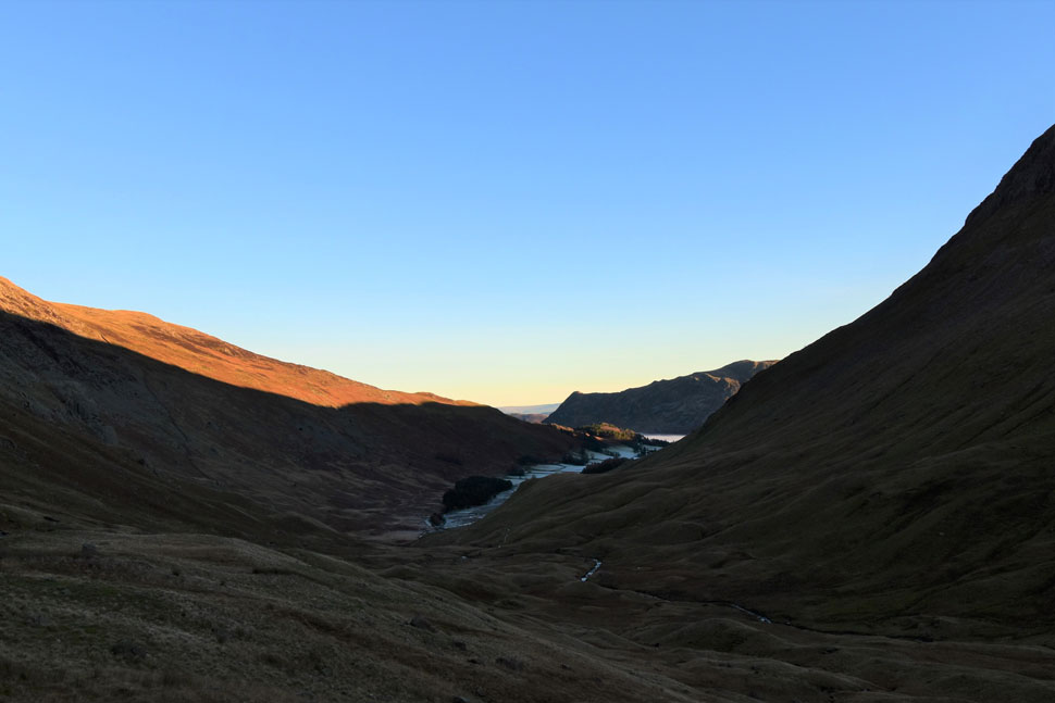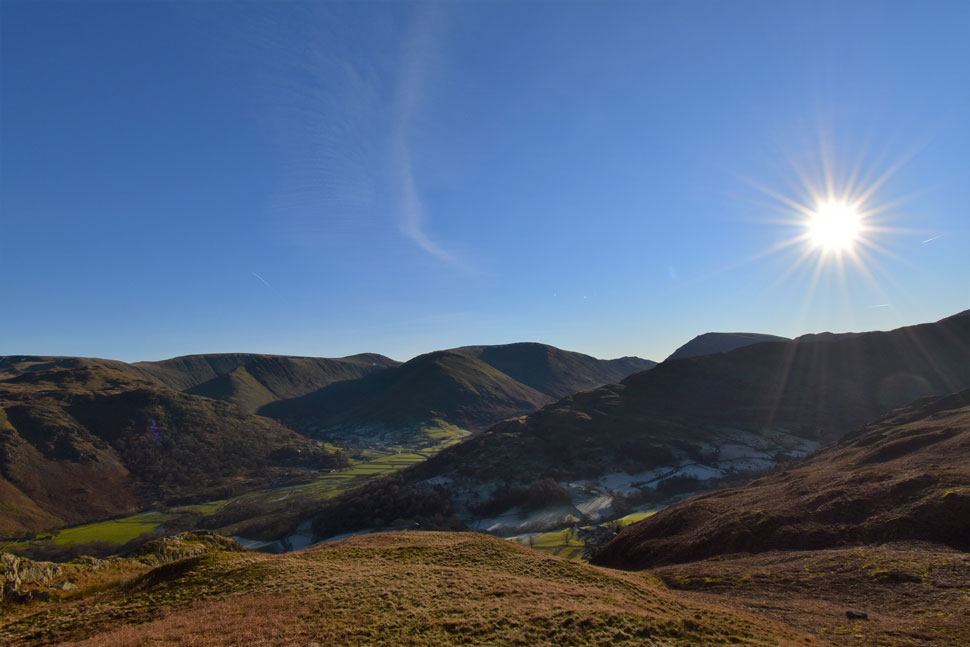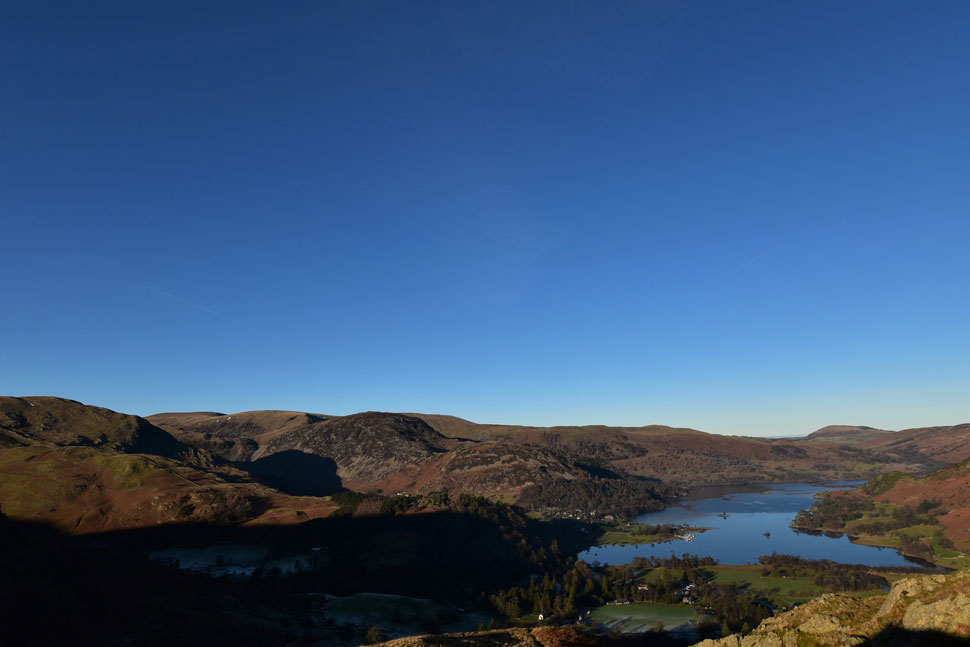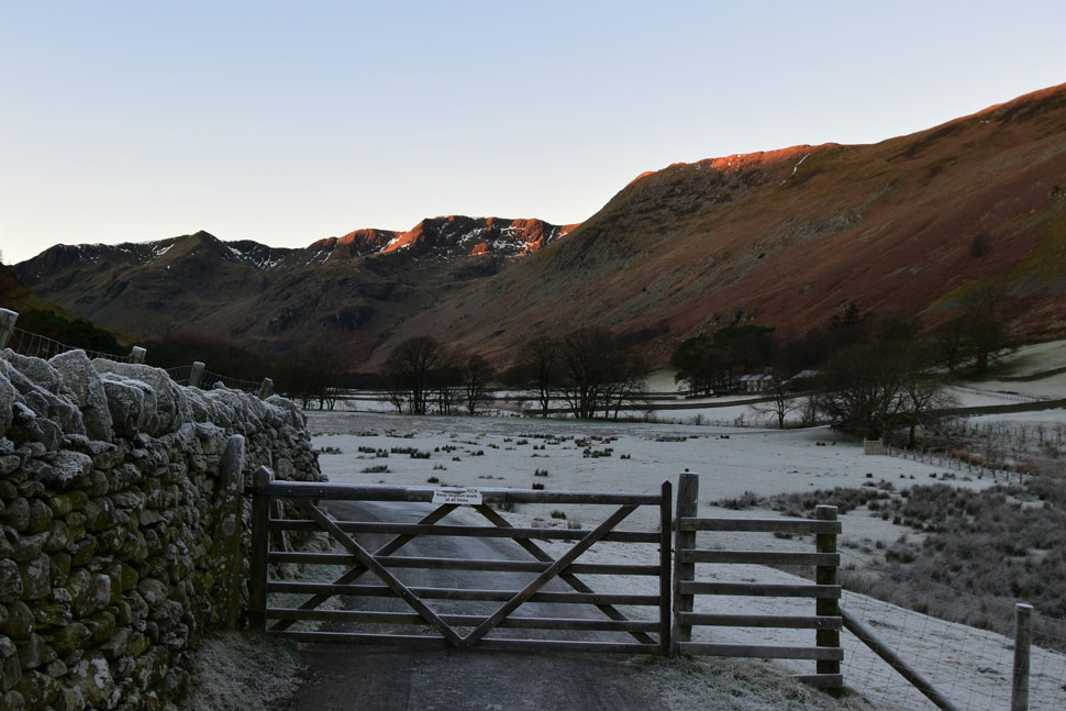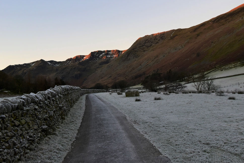 I descended by the familiar stone wall where sparse tree cover left the frost covered ground in cold shade. It had been a few hours since I last saw my breath but I could see it again and soon the chill nipped at the ends of my gloveless fingers. It was incredible to think that the temperature on St Sunday Crag was a staggering 13°C while at valley level it was hovering around freezing level.