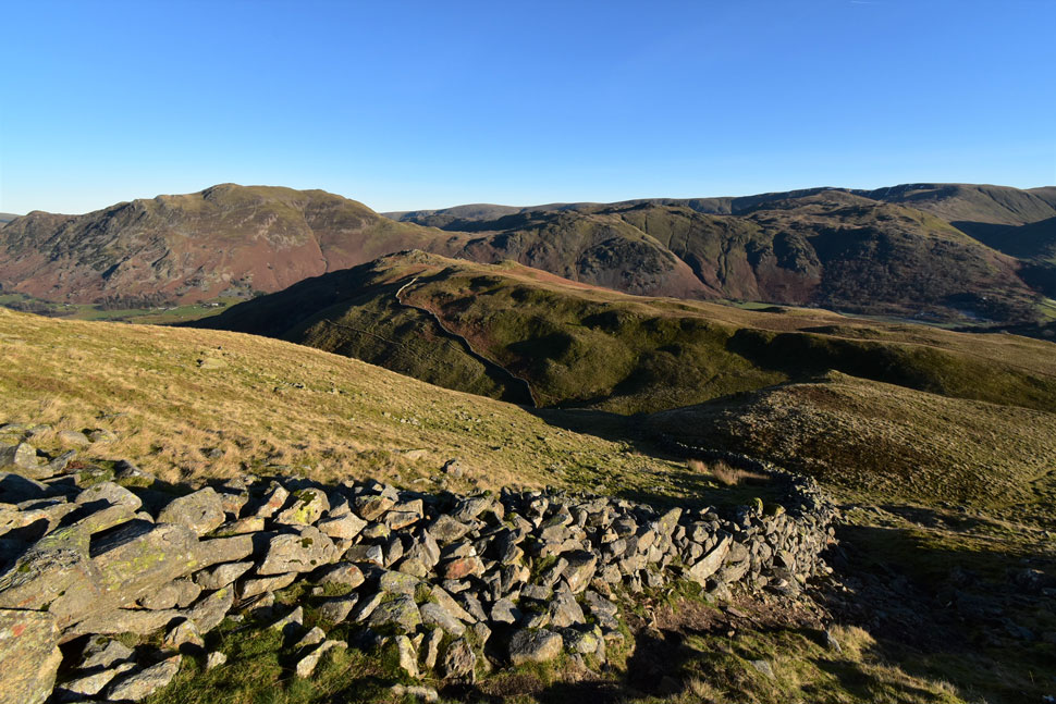 Glenridding Dodd, Heron Pike, Sheffield Pike, Greenside, Stybarrow Dodd, Hart Side and Little Mell Fell from the descent of Arnison Crag. |