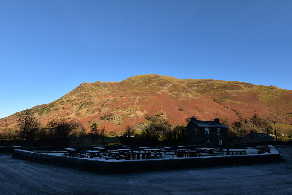 Place Fell is seen as I pass through the frozen grounds of the Patterdale Hotel. |