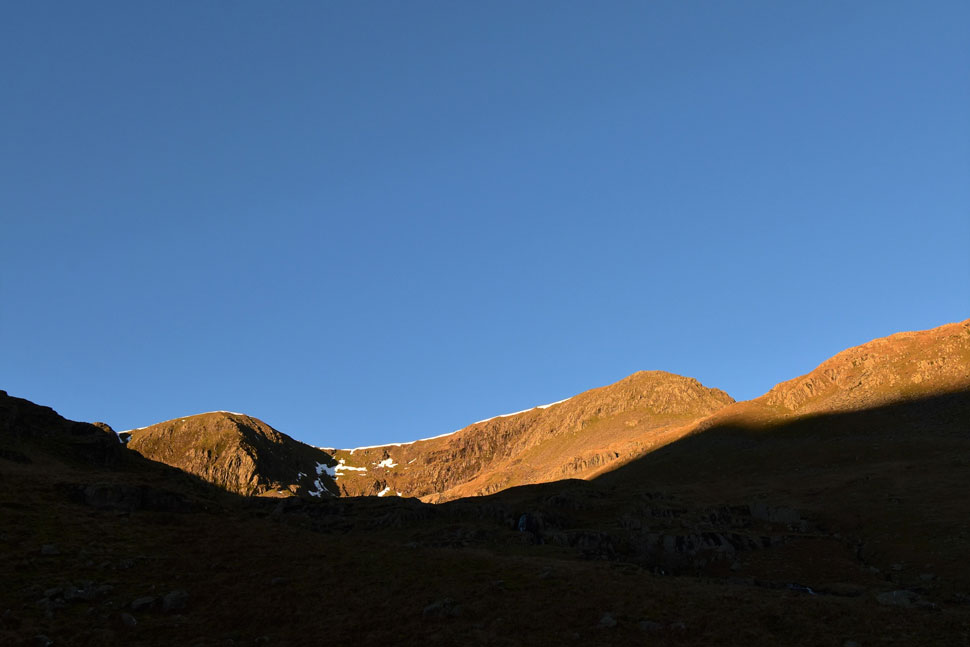 Still in shade and really looking forward to the glimmers of sunlight I could see on the eastern flanks of St Sunday Crag I begin the ascent towards Deepdale Hause. |