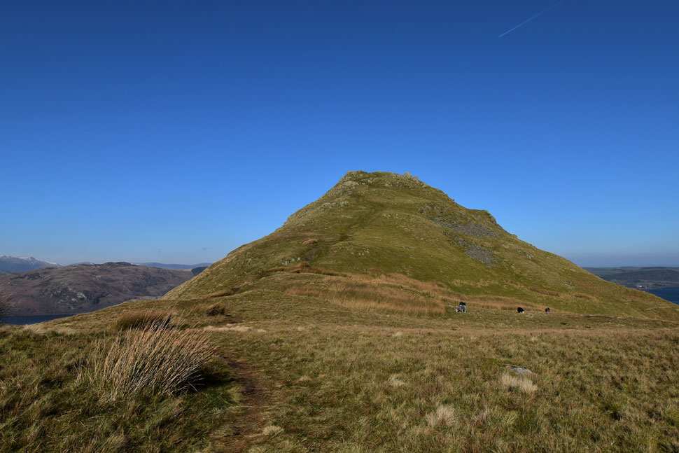 I dropped down from the summit where not only could I escape the wind but take in this brilliant view of Ullswater and Hallin Fell. I've sat here many a time eating my lunch but not today, the wind wasn't having any of it so I returned to the summit with thoughts of Loadpot Hill next. |