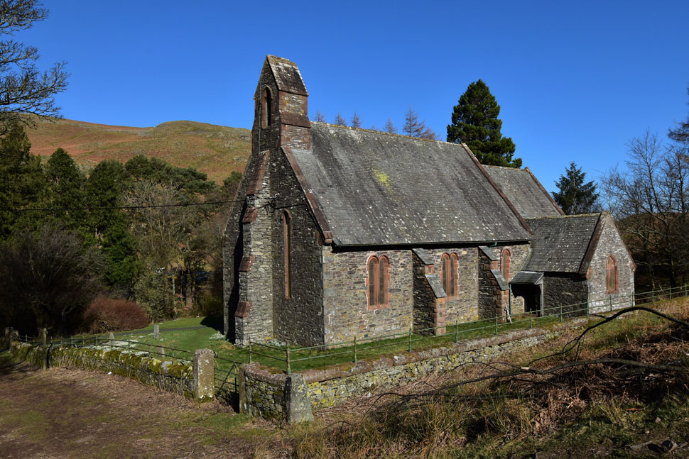 I took my time driving along the Ullswater shore towards Howtown mainly because debris from the lake littered this road too. The sun hadn't breached the surrounding hill sides when I arrived at Martindale New Church where I was lucky to grab one of two last remaining parking places, not helped by a long wheel base motor home which had berthed horizontally at the parking spaces opposite the church selfishly taking at least three parking spaces while doing so.