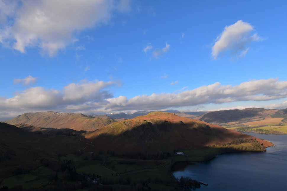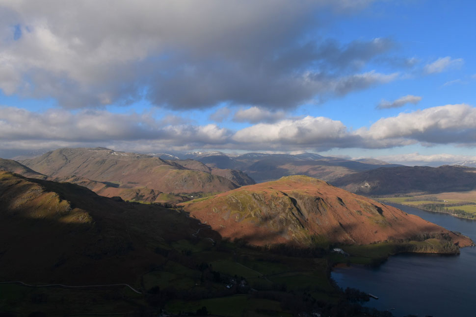 Sunlight over Hallin Fell, Place Fell and High Dodd with Gowbarrow Fell seen right. |