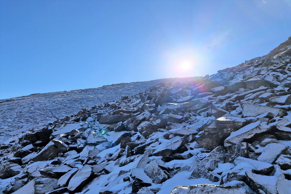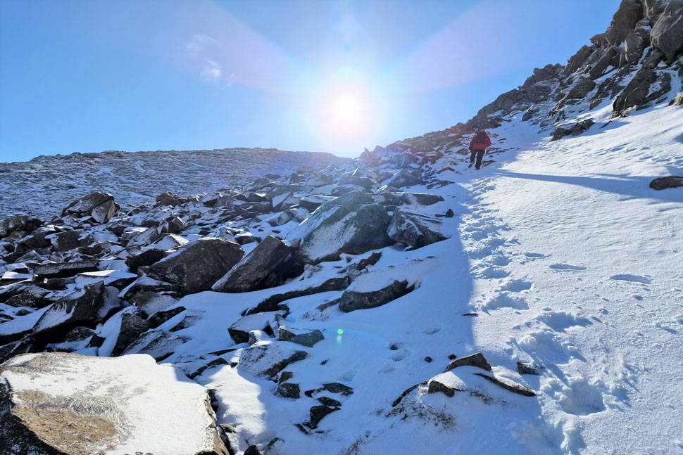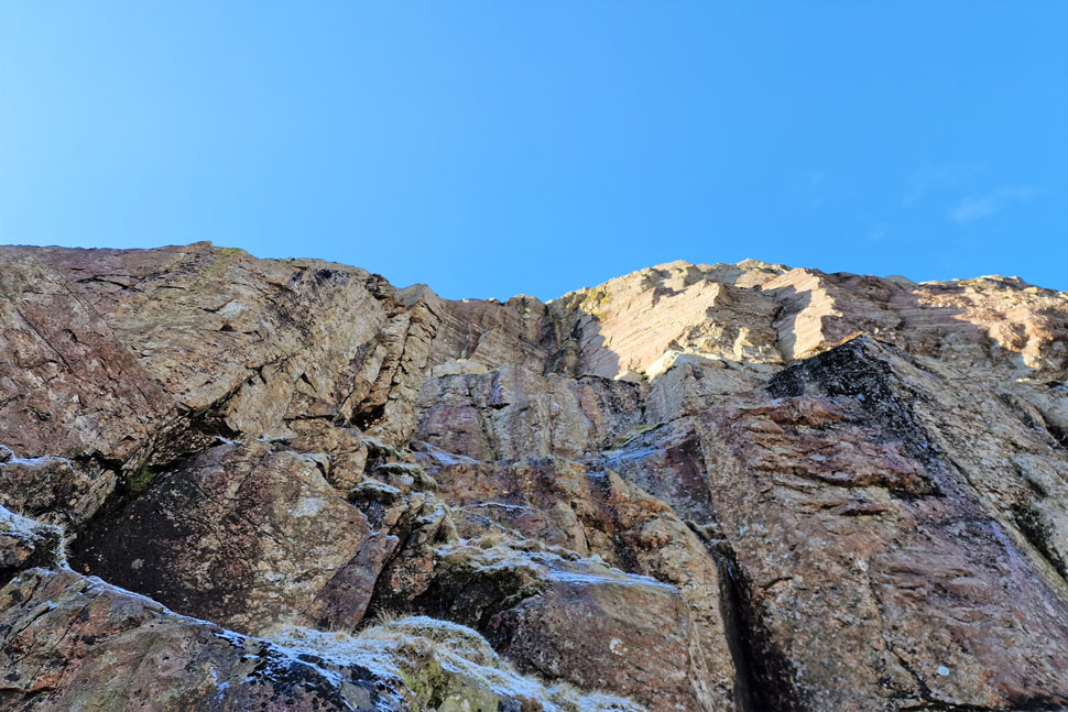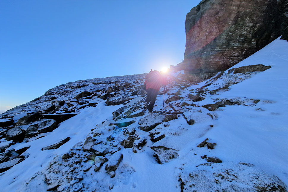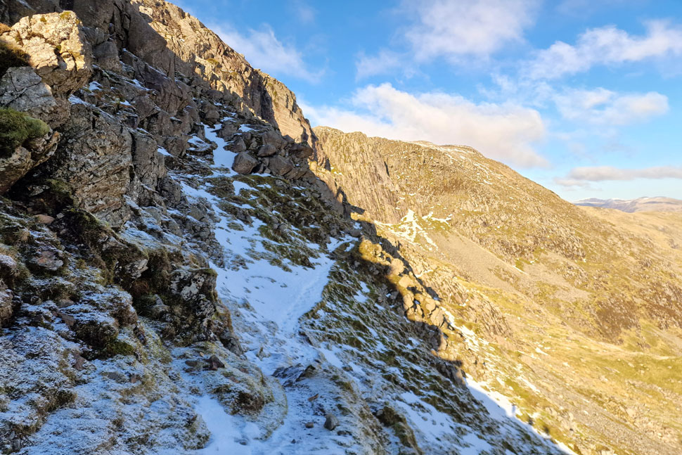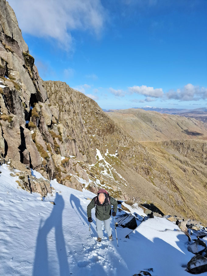 It's quite a steep approach until the Climbers Traverse is reached properly made easier by the frozen ground underfoot. That however, didn't stop Rod snapping one of his carbon Black Diamond walking poles as he went to negotiate a raised grassy shelf. |