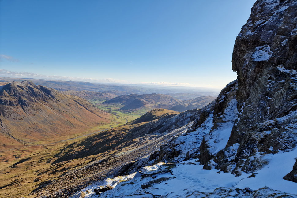 Gimmer Crag and Loft Crag with Mickleden and Great Langdale below. |