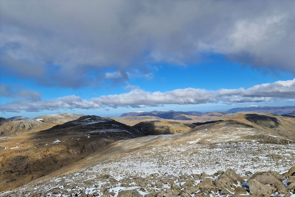 Views over Esk Hause towards Great End, Great Gable, Base Brown, Seathwaite Fell and Allen Crags. |