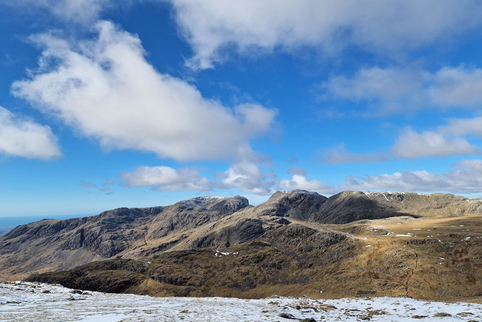 Great Knott, Crinkle Crags, The Band and Bow Fell. |