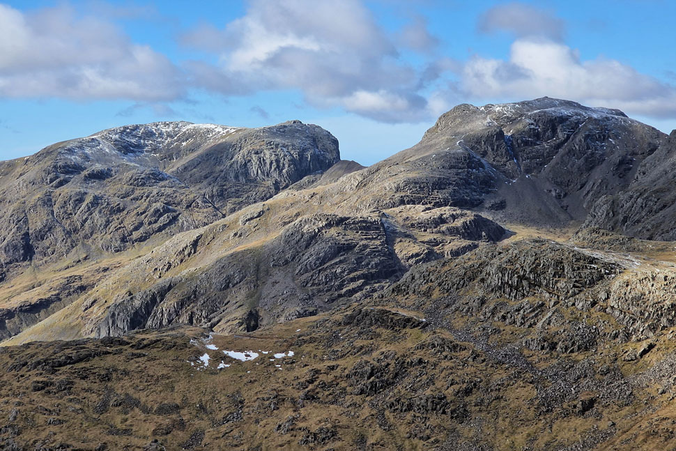 Sca Fell, Broad Crag, Mickledore and Scafell Pike. |