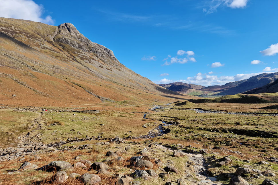 Views into the Mickleden valley with Rossett Pike seen left and Pike O'Stickle seen right. |