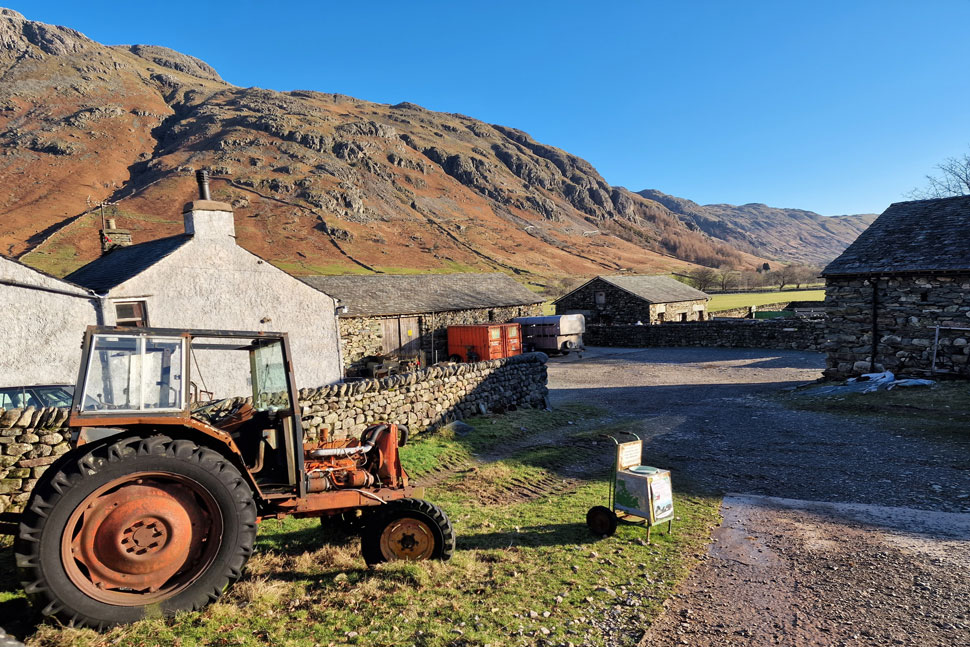 We left the car park under brilliant blue skies and were soon stopped by this magnificent view of Great Knott, Crinkle Crags, The Band and Bow Fell (far right) But first we need to pass through Stool End Farm which can just be made out in the centre of the photo. |