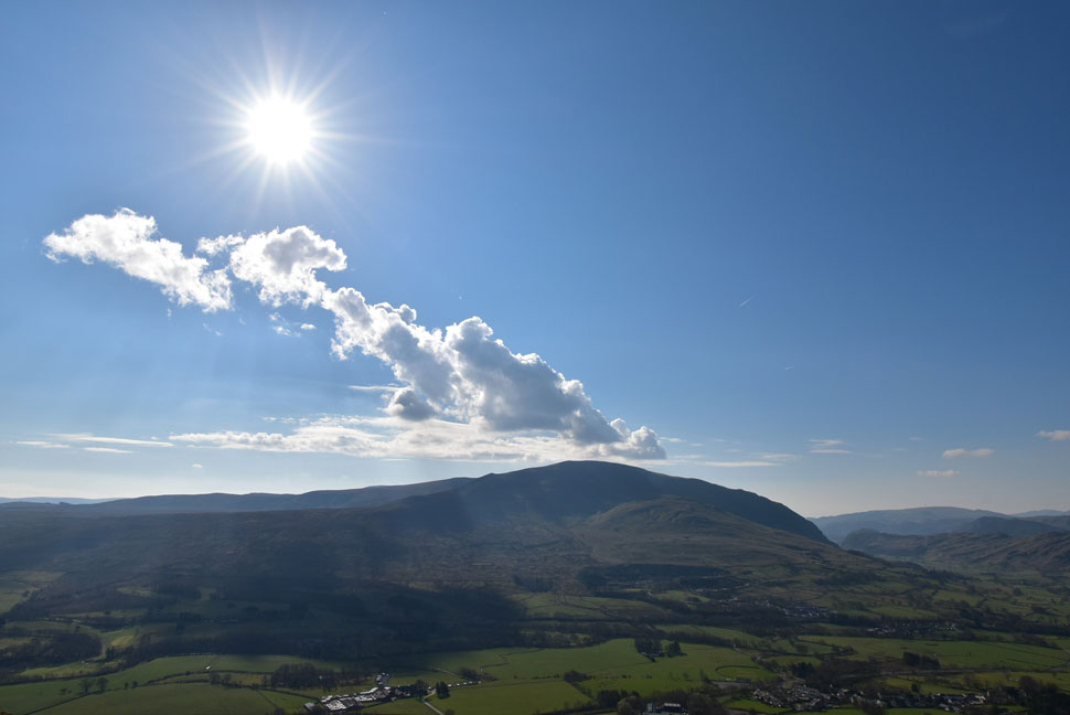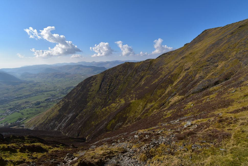The roof tops of Threlkeld come into view while being greeted by the sound of traffic travelling along a busy A66 below. The path turned east whilst the gradient slackened my view is filled by Knott Halloo and Gate Gill. Cloud had gathered leaving anything south of Keswick in shade whilst directly above the sky remained a deep blue.